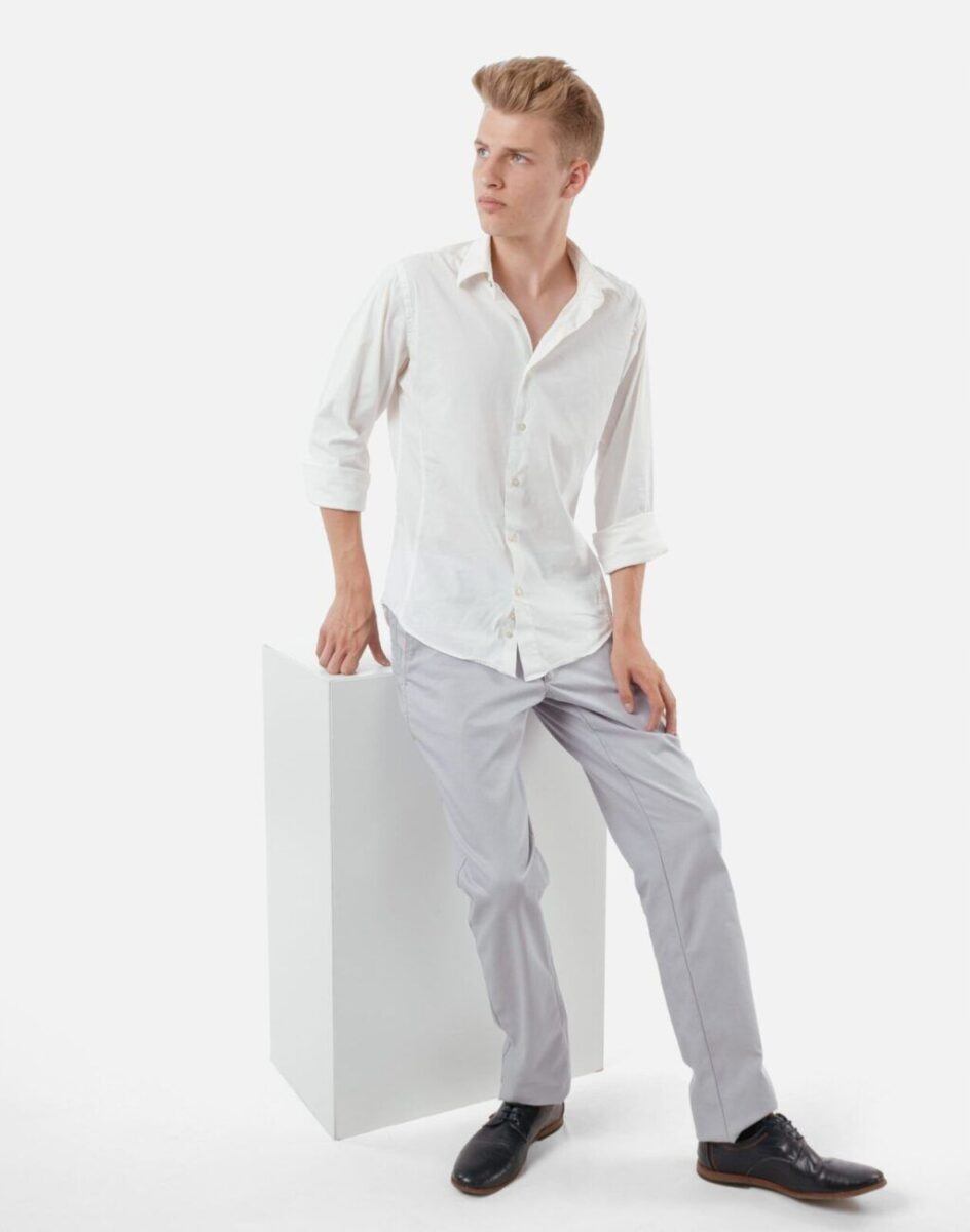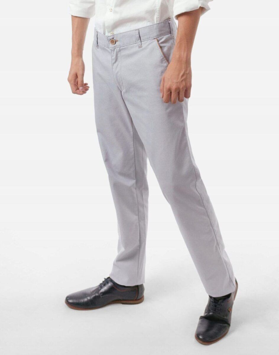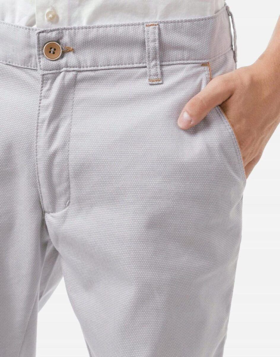 Casualowe spodnie męskie typu Chinosy uszyte z wysokiej jakości ekologicznej tkaniny będącej mieszanką bawełny i elastanu to wygodne rozwiązanie na ciepłe dni wiosny i lata oraz niezbędny element wakacyjnej garderoby. Wygodne, z nieco luźniejszą nogawką, niekrępujące ruchów, idealne na co dzień jako element casualowego stroju, czyniąc go lekkim i dostosowanym do wysokich temperatur. Zapinane na kryty zamek błyskawiczny i guzik posiadają charakterystyczne dla Chinosów dwie skośne kieszenie na dłonie na bokach spodni i dwie wpuszczane kieszenie zapinane na guzik z tyłu. W pasie szlufki umożliwiające stylizacje z paskiem. Klasyczna lekko zwężana nogawka nie zaprasowana na kant.