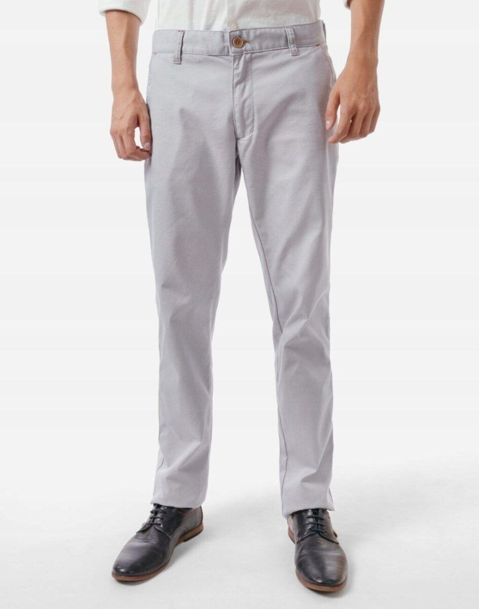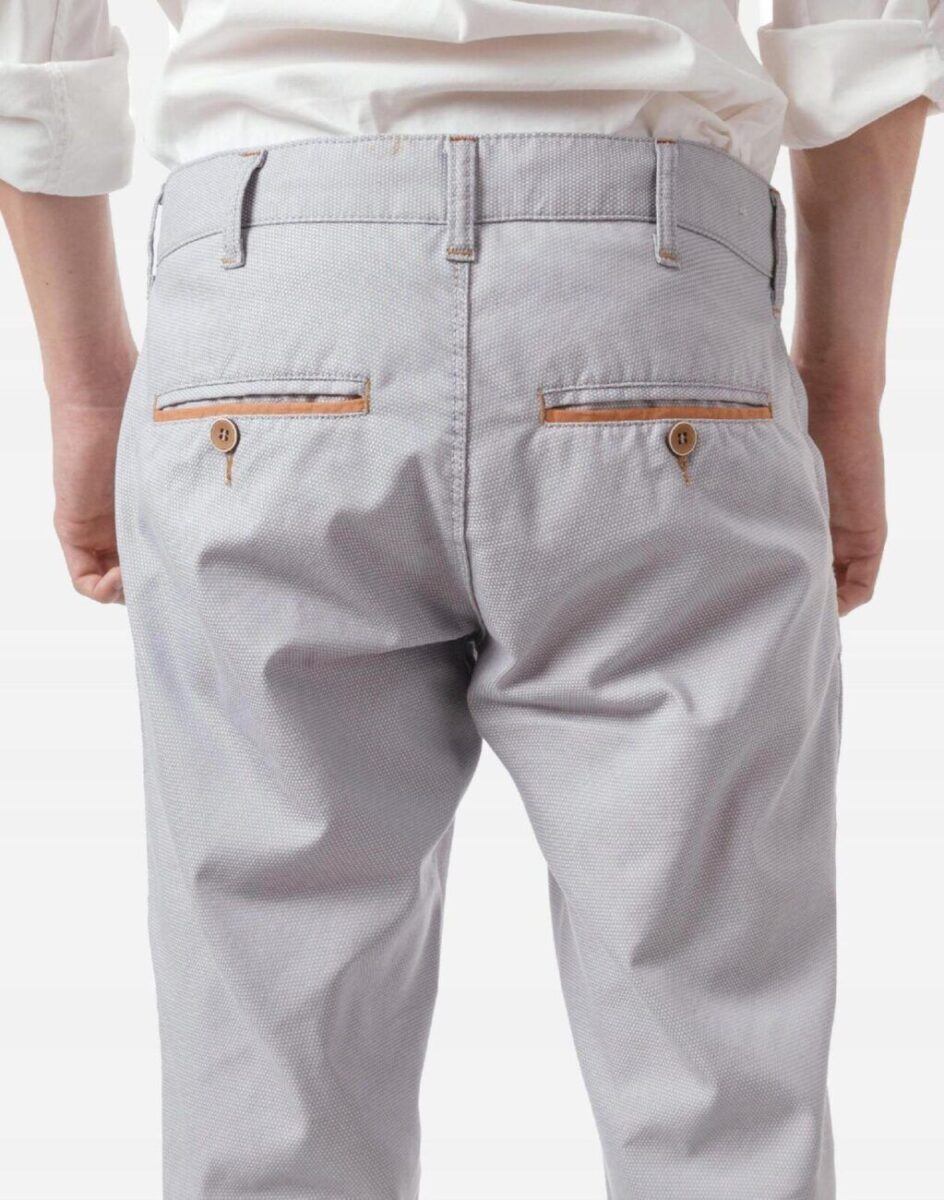 Casualowe spodnie męskie typu Chinosy uszyte z wysokiej jakości ekologicznej tkaniny będącej mieszanką bawełny i elastanu to wygodne rozwiązanie na ciepłe dni wiosny i lata oraz niezbędny element wakacyjnej garderoby. Wygodne, z nieco luźniejszą nogawką, niekrępujące ruchów, idealne na co dzień jako element casualowego stroju, czyniąc go lekkim i dostosowanym do wysokich temperatur. Zapinane na kryty zamek błyskawiczny i guzik posiadają charakterystyczne dla Chinosów dwie skośne kieszenie na dłonie na bokach spodni i dwie wpuszczane kieszenie zapinane na guzik z tyłu. W pasie szlufki umożliwiające stylizacje z paskiem. Klasyczna lekko zwężana nogawka nie zaprasowana na kant.