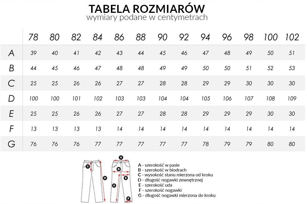 Spodnie zapinane są na zamek błyskawiczny i guzik. Z przodu posiadają dwie kieszenie na dłonie, z tyłu dwie kieszenie naszywane. W pasie szlufki umożliwiające stylizacje z paskiem. Uszyte z miękkiej, elastycznej tkaniny bawełnianej zapewniają ogromny komfort noszenia. Wąskie, dopasowane nogawki zakończone są komfortowym ściągaczem.
