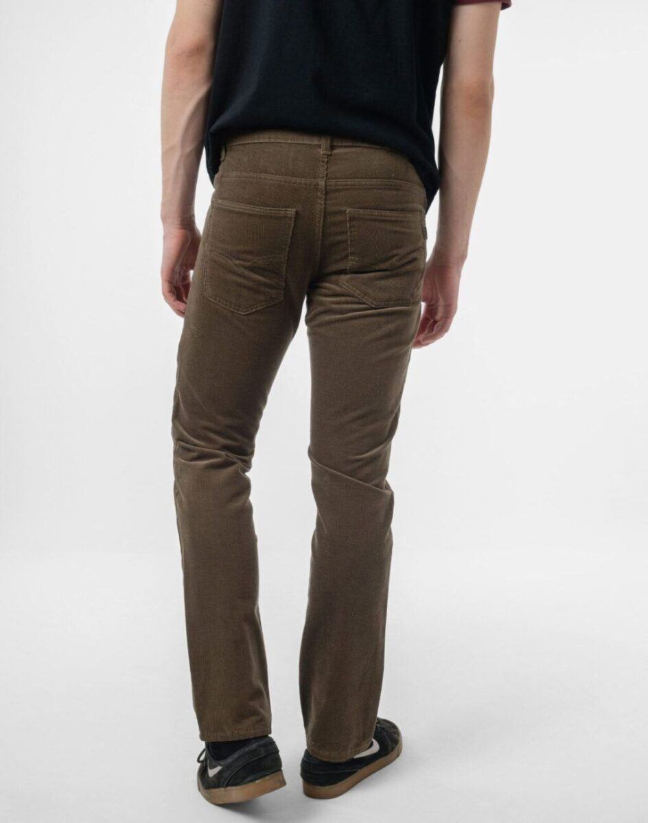 Wyprodukowane z ekologicznej tkaniny bawełnianej z niewielkim dodatkiem elastanu w charakterystyczny drobny prążek, miękkiej i ciepłej, bardzo wygodnej w użytkowaniu. Prosty, klasyczny fason spodni Regular Fit o bardzo dobrym i sprawdzonym przez wielu zadowolonych klientów kroju. Zapinane są na kryty zamek błyskawiczny i metalowy guzik sygnowany logiem firmy. Z przodu mają dwie kieszonki zaokrąglone oraz mniejszą kieszonkę tzw. bilonówkę, a na tyle klasyczne kieszenie naszywane jak w typowych spodniach jeansowych. W pasie szlufki umożliwiające stylizacje z paskiem. Klasyczna prosta nogawka nie zaprasowana na kant. Najbardziej podatne na uszkodzenia miejsca wzmocnione są dodatkowymi przeszyciami oraz nitami.
