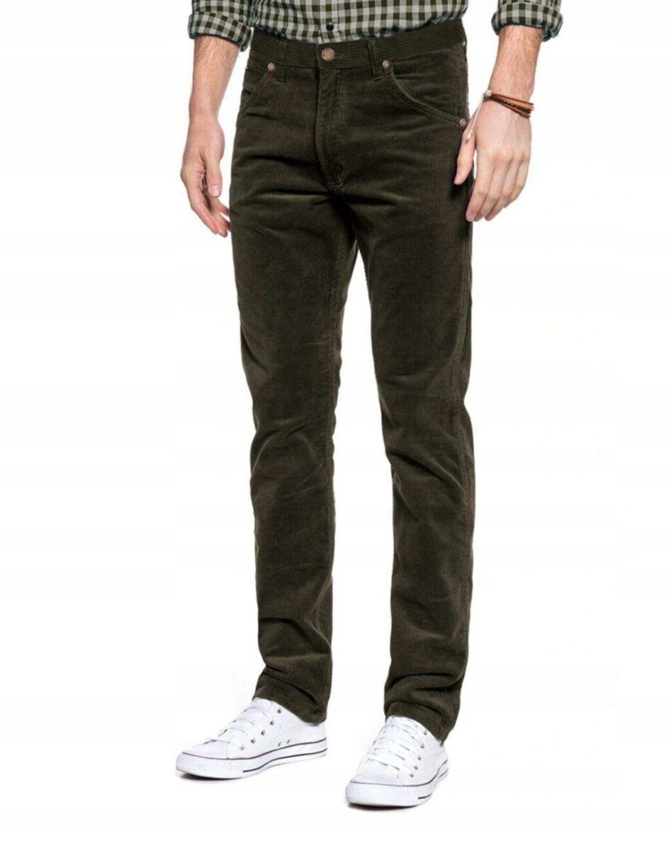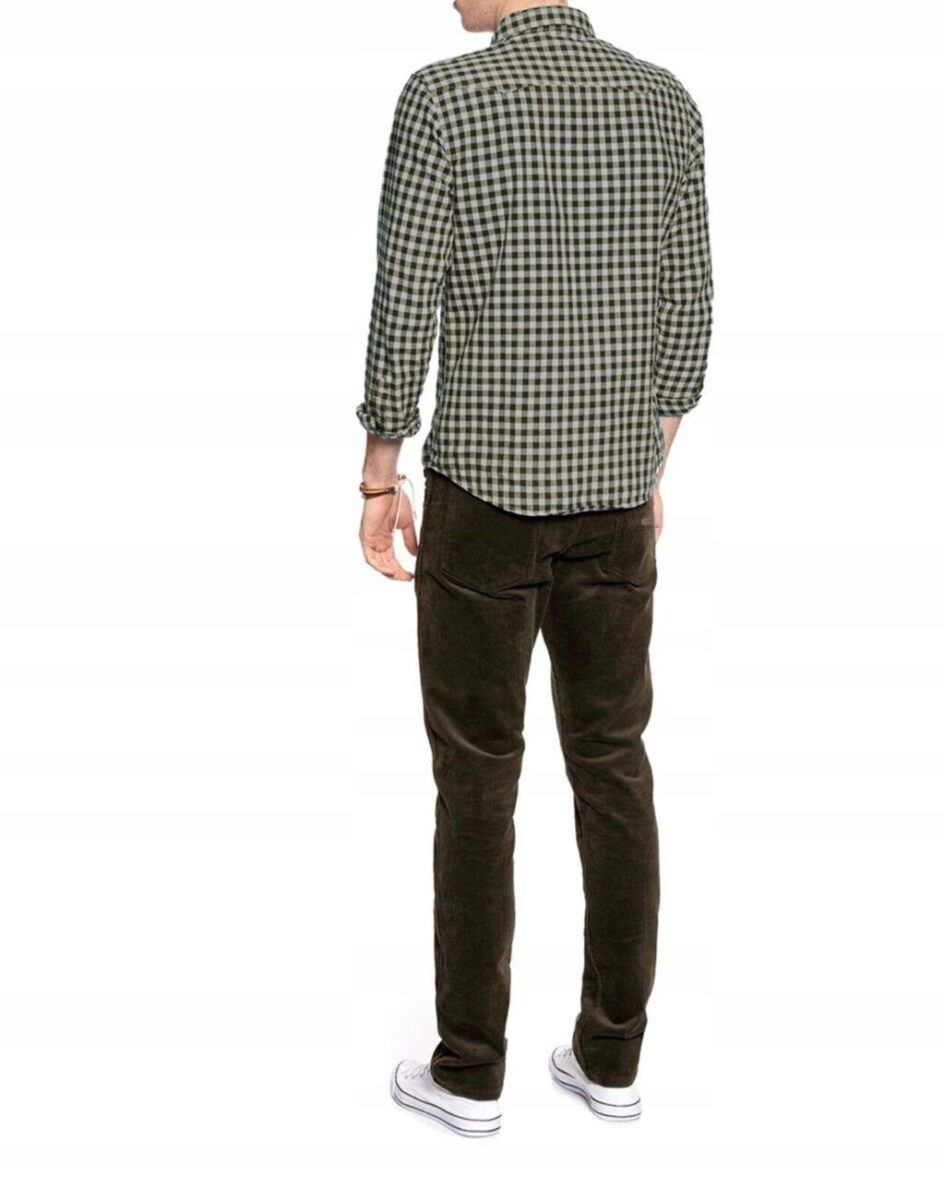 Wyprodukowane z ekologicznej tkaniny bawełnianej z niewielkim dodatkiem elastanu i poliestru w charakterystyczny gruby prążek, miękkiej i ciepłej, bardzo wygodnej w użytkowaniu. Prosty, klasyczny fason spodni Regular Fit o bardzo dobrym i sprawdzonym przez wielu zadowolonych klientów kroju. Zapinane są na kryty zamek błyskawiczny i metalowy guzik sygnowany logiem firmy. Z przodu mają dwie kieszonki zaokrąglone oraz mniejszą kieszonkę tzw. bilonówkę, a na tyle klasyczne kieszenie naszywane jak w typowych spodniach jeansowych. W pasie szlufki umożliwiające stylizacje z paskiem. Klasyczna prosta nogawka nie zaprasowana na kant. Najbardziej podatne na uszkodzenia miejsca wzmocnione są dodatkowymi przeszyciami oraz nitami.