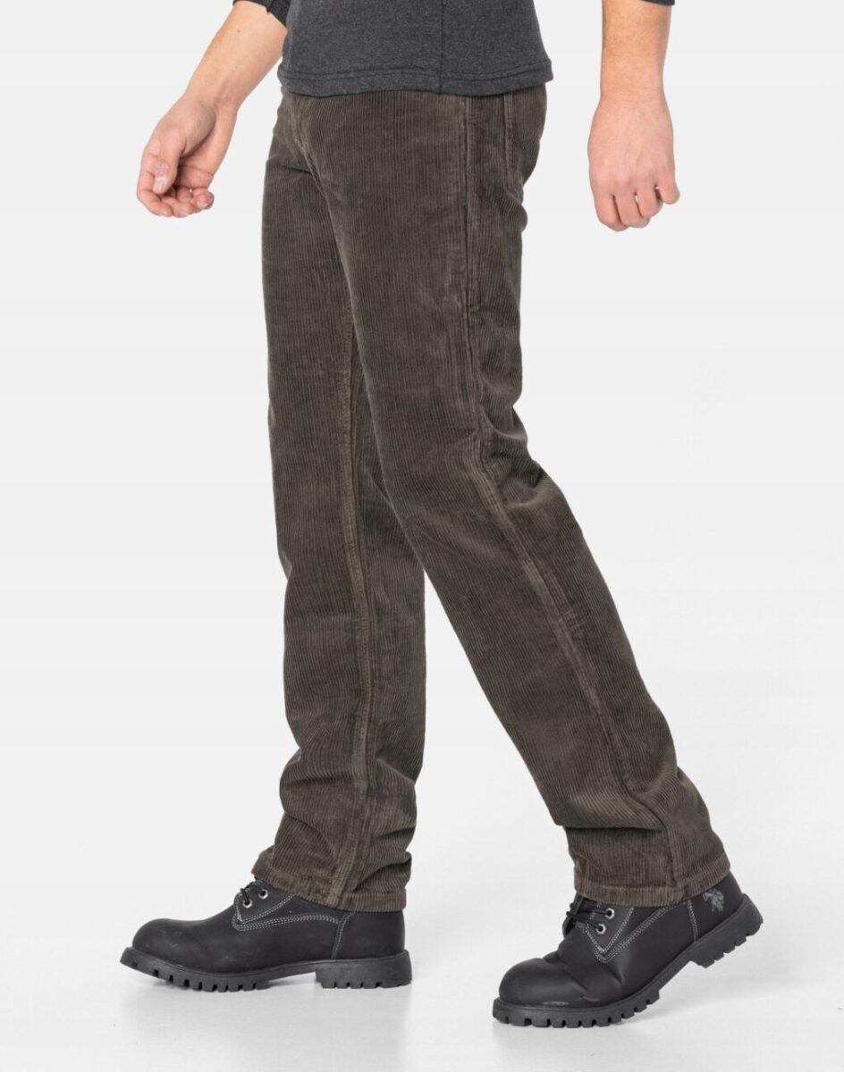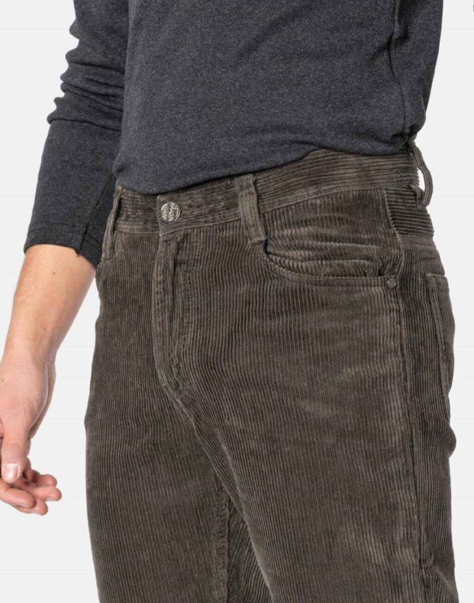 Wyprodukowane z ekologicznej tkaniny 100% bawełnianej w charakterystyczny gruby prążek, miękkiej i ciepłej, bardzo wygodnej w użytkowaniu. Prosty, klasyczny fason spodni Regular Fit o bardzo dobrym i sprawdzonym przez wielu klientów kroju. Zapinane są na kryty zamek błyskawiczny i guzik sygnowany logiem firmy. Z przodu mają dwie kieszonki zaokrąglone oraz mniejszą kieszonkę tzw. bilonówkę, a na tyle klasyczne kieszenie naszywane jak w typowych spodniach jeansowych. W pasie szlufki umożliwiające stylizacje z paskiem. Klasyczna prosta nogawka nie zaprasowana na kant. Najbardziej podatne na uszkodzenia miejsca wzmocnione są dodatkowymi przeszyciami oraz nitami.