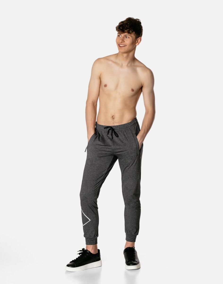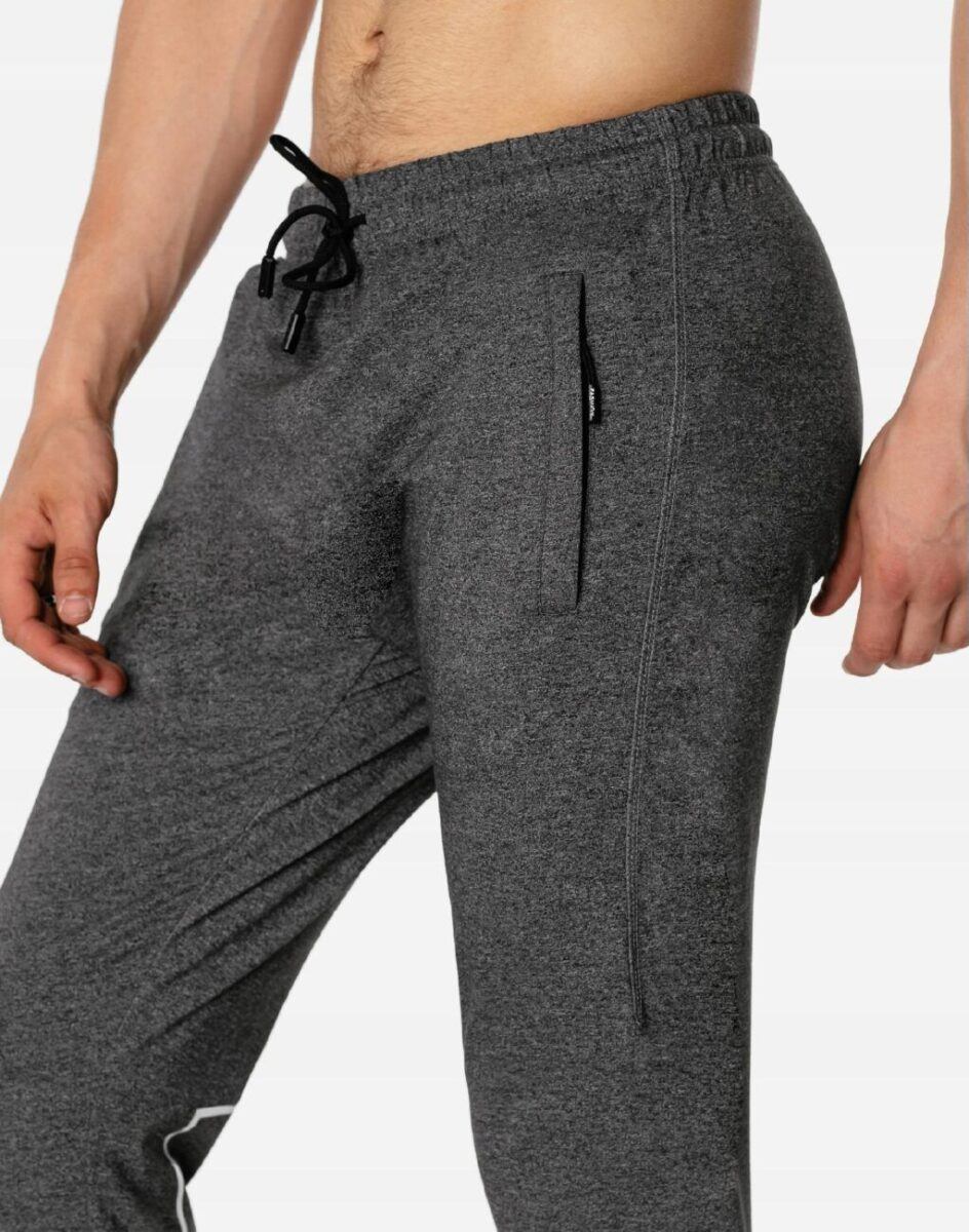 Spodnie dresowe męskie #46033 to komfortowo skrojony model w sportowym stylu ze zwężanymi nogawkami zakończonymi ściągaczem. Z założenia wyróżniają się dużą wygodą, a dopasowanie w pasie zapewnia szeroki, elastyczny pas ściągający oraz dodatkowo wpuszczona w pasek taśma regulacyjna z możliwością jej zawiązywania. Na bokach spodni dwie wpuszczane kieszenie na dłonie zasuwane na zamki błyskawiczne. Tył gładki bez kieszeni. Ergonomiczny krój spodni nie ogranicza swobody ruchów, a właściwe dla odzieży sportowej proporcje surowcowe wpływają pozytywnie na komfort użytkowania. Sylwetka użytkownika staje się w nich optycznie smuklejsza i nabiera dynamicznego sportowego wyglądu.