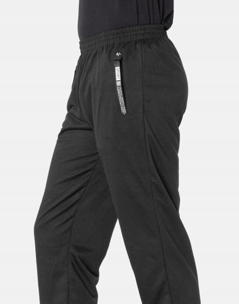 Spodnie dresowe męskie 46035 to komfortowo skrojony model w sportowym stylu z lekko zwężanymi nogawkami zakończonymi ściągaczem. Z założenia wyróżniają się dużą wygodą, a dopasowanie w pasie zapewnia szeroki, elastyczny pas ściągający oraz dodatkowo wpuszczona w pasek taśma regulacyjna z możliwością jej zawiązywania. Na bokach spodni dwie wpuszczane kieszenie na dłonie zasuwane na zamki błyskawiczne. Tył gładki bez kieszeni. Ergonomiczny krój spodni nie ogranicza swobody ruchów, a właściwe dla odzieży sportowej proporcje surowcowe wpływają pozytywnie na komfort użytkowania. Sylwetka użytkownika staje się w nich optycznie smuklejsza i nabiera dynamicznego sportowego wyglądu.
