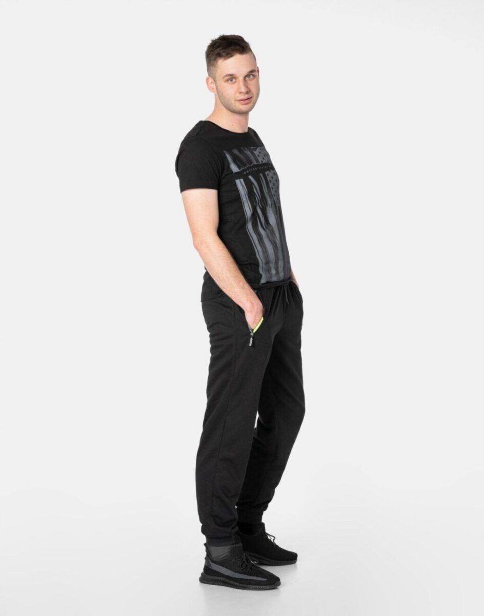Spodnie dresowe męskie 46092 to komfortowo skrojony model w sportowym stylu z lekko zwężanymi nogawkami zakończonymi ściągaczem. Z założenia wyróżniają się dużą wygodą, a dopasowanie w pasie zapewnia szeroki, elastyczny pas ściągający oraz dodatkowo wpuszczona w pasek taśma regulacyjna z możliwością jej zawiązywania. Na bokach spodni dwie wpuszczane kieszenie na dłonie zasuwane na zamki błyskawiczne. Tył gładki bez kieszeni. Ergonomiczny krój spodni nie ogranicza swobody ruchów a właściwe dla odzieży sportowej proporcje surowcowe wpływają pozytywnie na komfort użytkowania. Sylwetka użytkownika staje się w nich optycznie smuklejsza i nabiera dynamicznego sportowego wyglądu.
