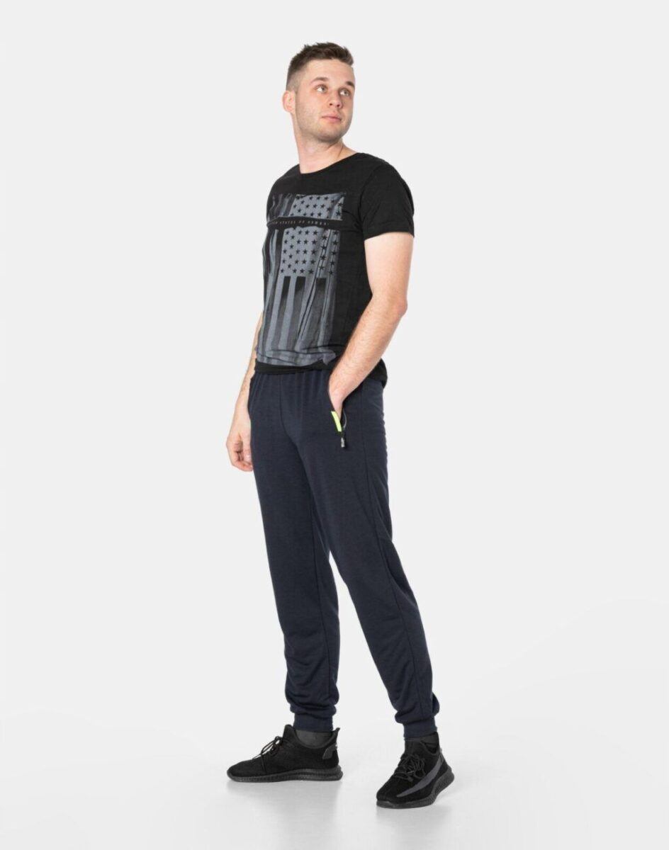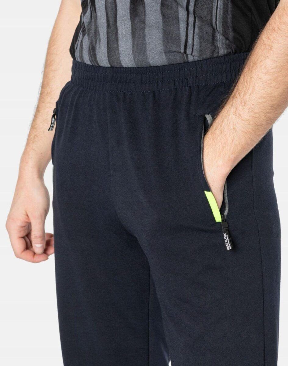 Spodnie dresowe męskie 46092 to komfortowo skrojony model w sportowym stylu z lekko zwężanymi nogawkami zakończonymi ściągaczem. Z założenia wyróżniają się dużą wygodą, a dopasowanie w pasie zapewnia szeroki, elastyczny pas ściągający oraz dodatkowo wpuszczona w pasek taśma regulacyjna z możliwością jej zawiązywania. Na bokach spodni dwie wpuszczane kieszenie na dłonie zasuwane na zamki błyskawiczne. Tył gładki bez kieszeni. Ergonomiczny krój spodni nie ogranicza swobody ruchów a właściwe dla odzieży sportowej proporcje surowcowe wpływają pozytywnie na komfort użytkowania. Sylwetka użytkownika staje się w nich optycznie smuklejsza i nabiera dynamicznego sportowego wyglądu.