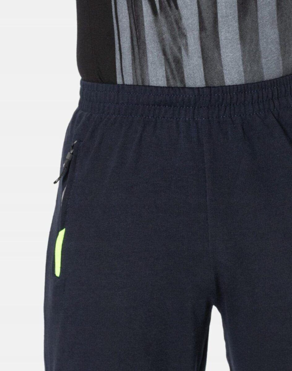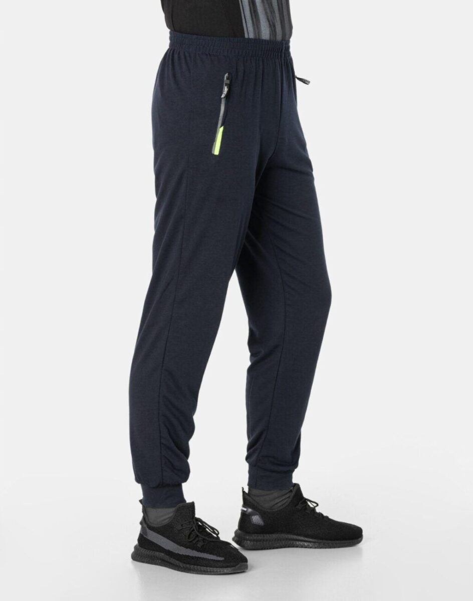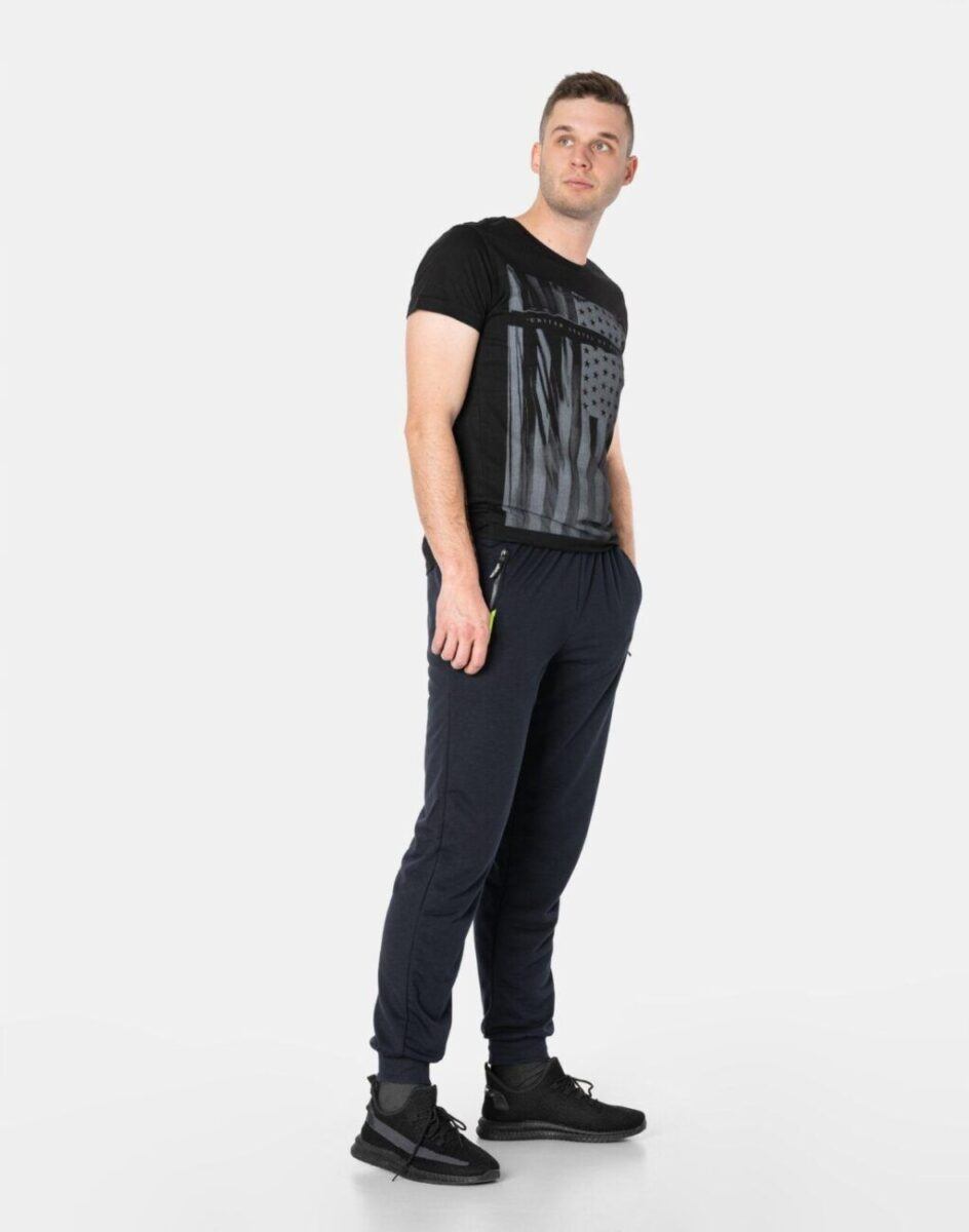 Spodnie dresowe męskie 46092 to komfortowo skrojony model w sportowym stylu z lekko zwężanymi nogawkami zakończonymi ściągaczem. Z założenia wyróżniają się dużą wygodą, a dopasowanie w pasie zapewnia szeroki, elastyczny pas ściągający oraz dodatkowo wpuszczona w pasek taśma regulacyjna z możliwością jej zawiązywania. Na bokach spodni dwie wpuszczane kieszenie na dłonie zasuwane na zamki błyskawiczne. Tył gładki bez kieszeni. Ergonomiczny krój spodni nie ogranicza swobody ruchów a właściwe dla odzieży sportowej proporcje surowcowe wpływają pozytywnie na komfort użytkowania. Sylwetka użytkownika staje się w nich optycznie smuklejsza i nabiera dynamicznego sportowego wyglądu.