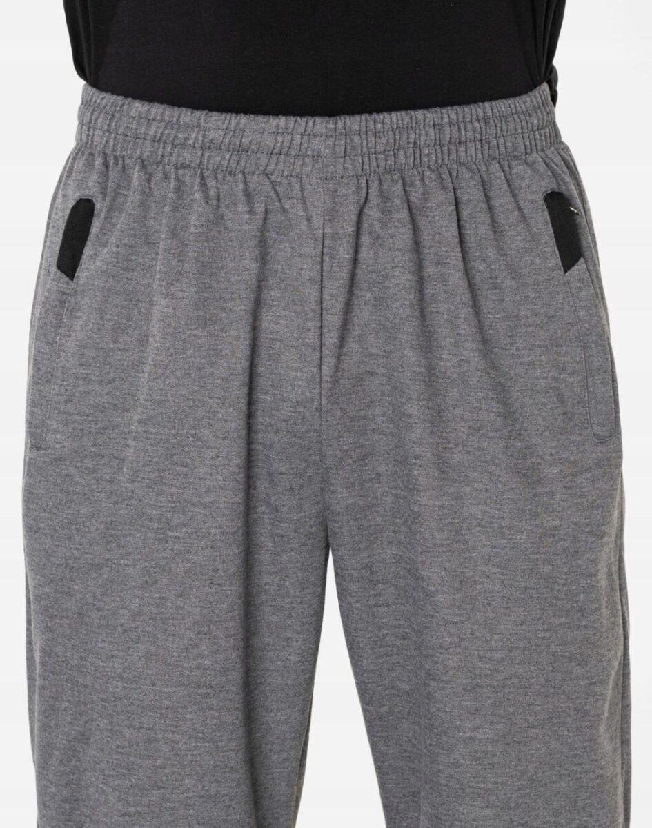 Spodnie dresowe męskie 46322 to komfortowo skrojony model w sportowym stylu z prostymi nogawkami. Z założenia wyróżniają się dużą wygodą, a dopasowanie w pasie zapewnia szeroki, elastyczny pas ściągający oraz dodatkowo wpuszczona w pasek taśma regulacyjna z możliwością jej zawiązywania. Na bokach spodni dwie wpuszczane kieszenie na dłonie zasuwane na zamki błyskawiczne. Tył gładki bez kieszeni. Ergonomiczny krój spodni nie ogranicza swobody ruchów a właściwe dla odzieży sportowej proporcje surowcowe wpływają pozytywnie na komfort użytkowania.
