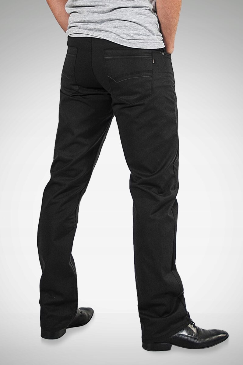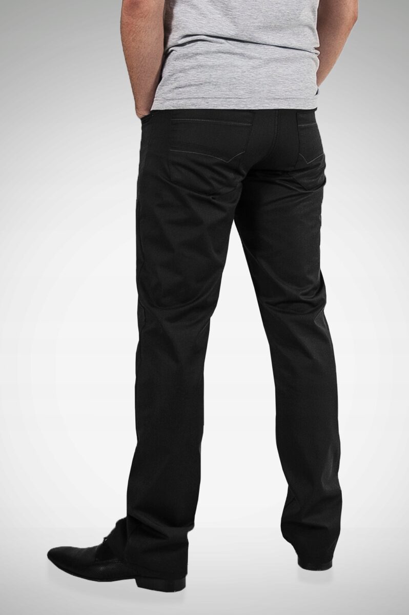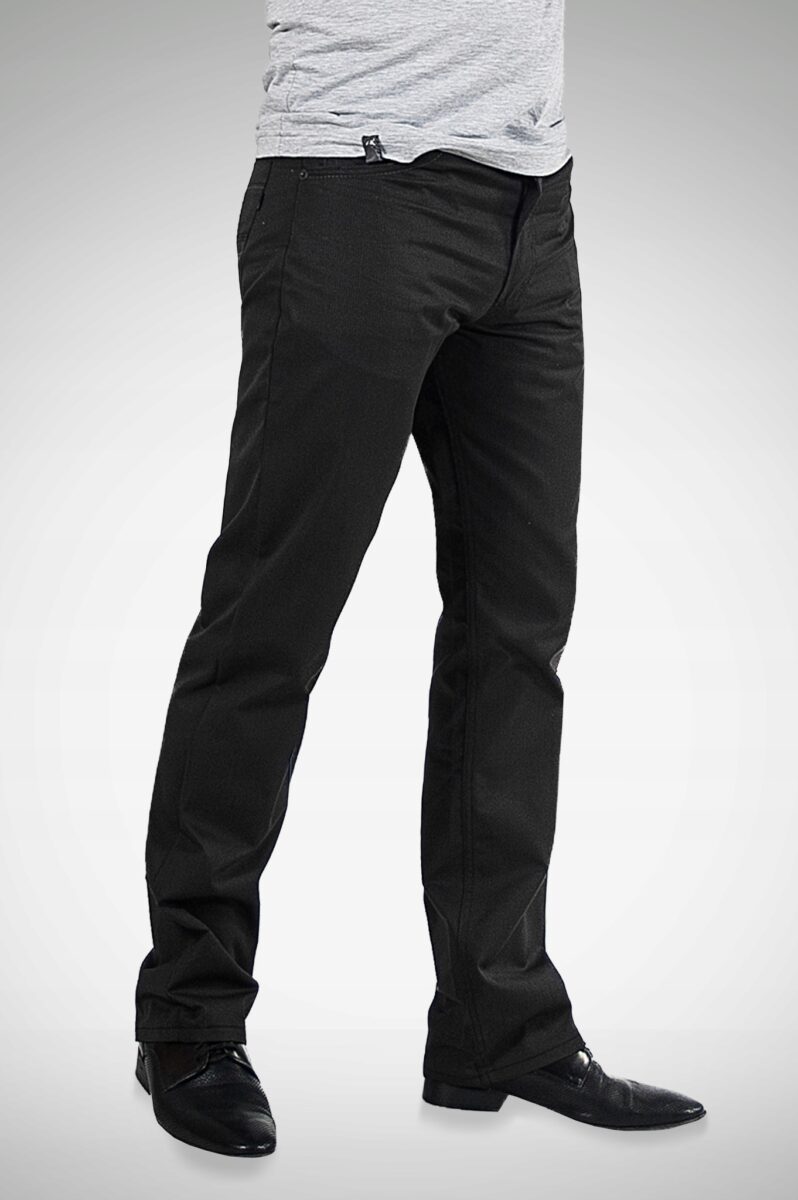 Spodnie męskie wizytowe o linii Slim w kolorze czarnym w delikatny prążek. Przeznaczone dla mężczyzn ceniących sobie sportowy, wygodny styl i nienaganną elegancję. Z powodzeniem łączą w sobie zalety użytkowe spodni sportowych (wygodny krój jak jeansy) i klasyczny wygląd spodni wizytowych (elegancki wizytowy materiał). Zapinane na kryty zamek błyskawiczny i guzik. Na bokach dwie kieszenie zaokrąglone wpuszczane oraz mniejsza kieszonka tzw. bilonówka. Na tyle dwie kieszenie nakładane jak w typowych spodniach jeansowych. W pasie szlufki umożliwiające stylizacje z paskiem. Modna zwężana nogawka typu SLIM nie zaprasowana na kant. Najbardziej podatne na uszkodzenia miejsca wzmocnione są dodatkowymi przeszyciami oraz nitami.