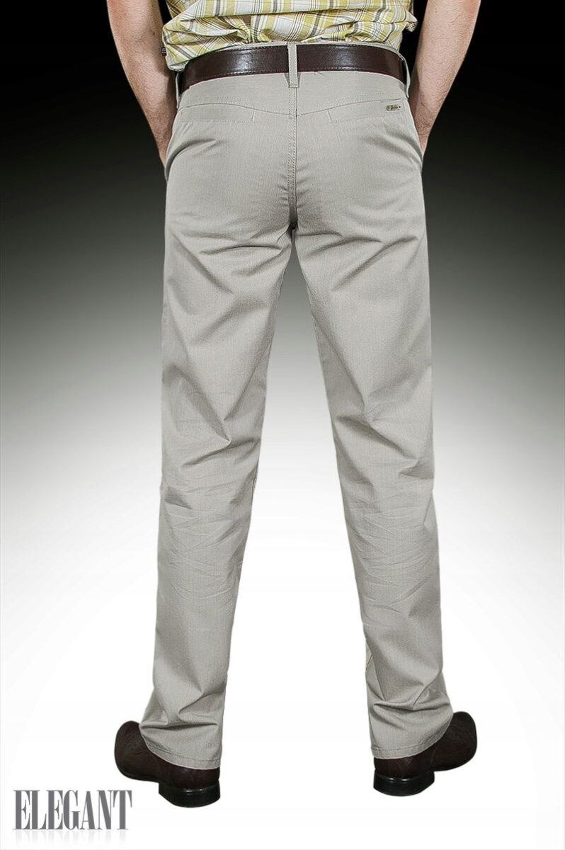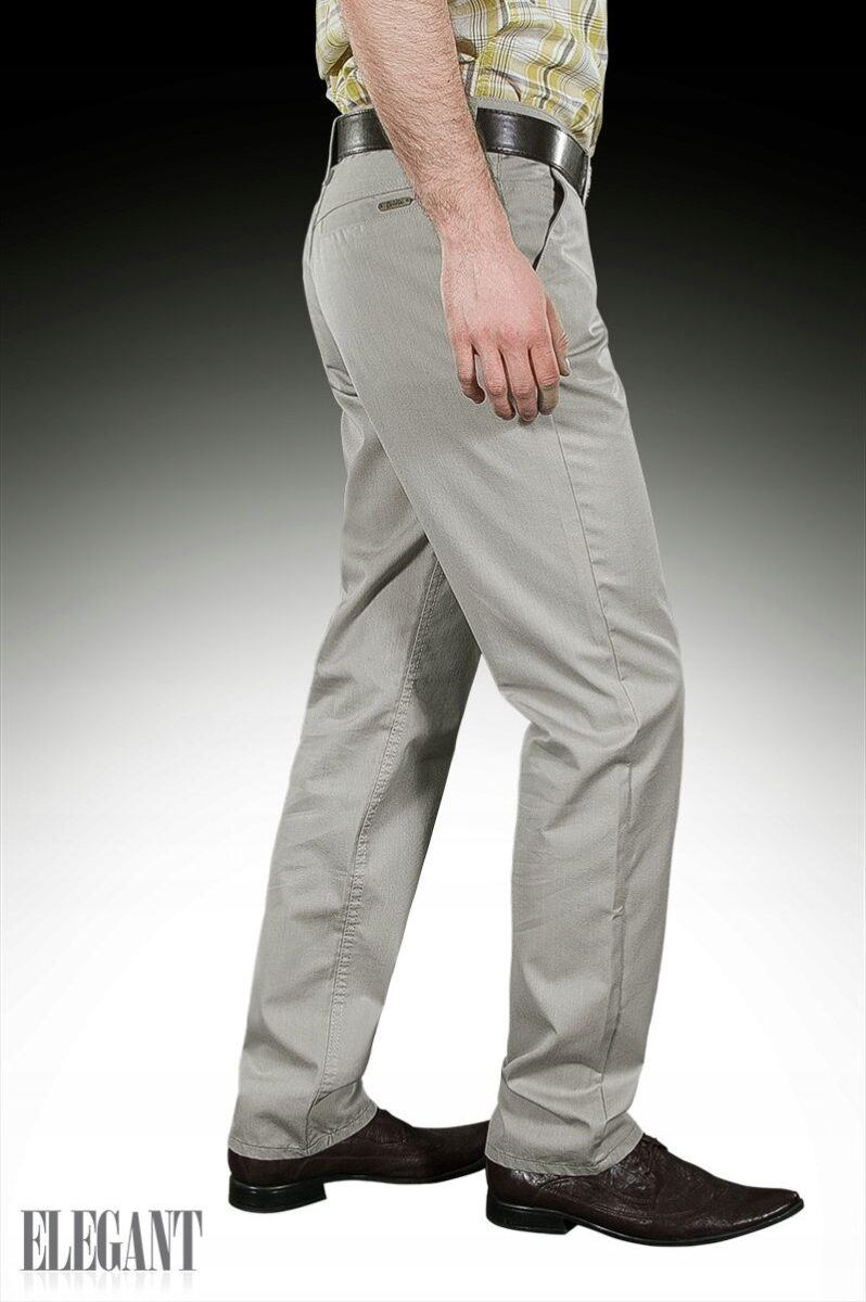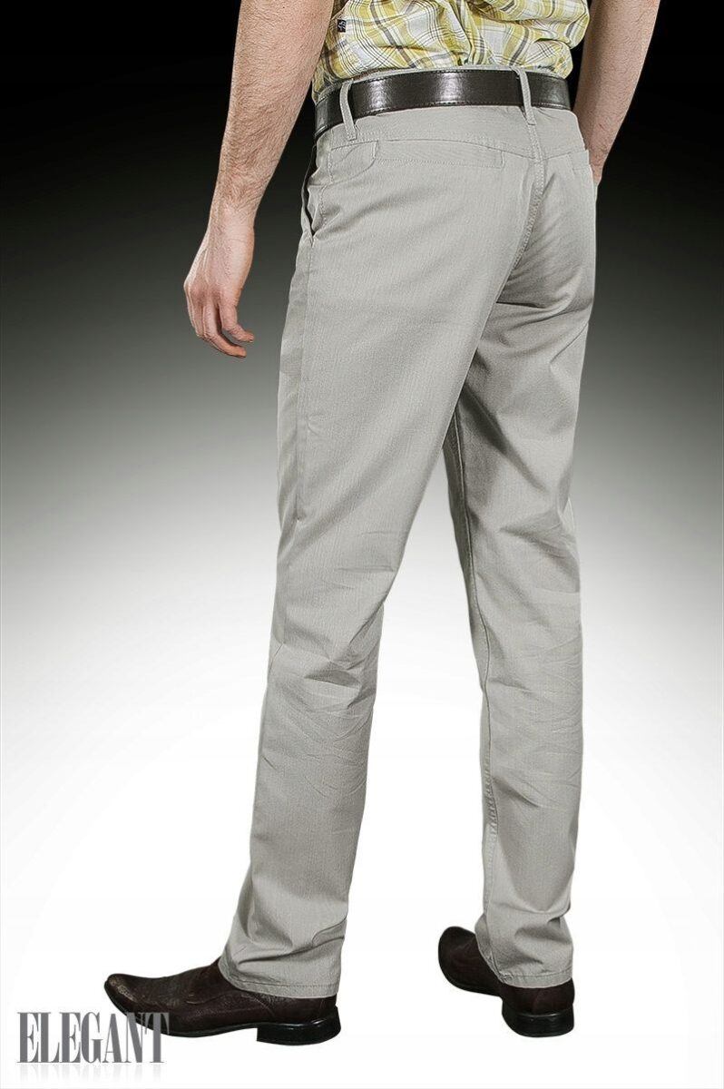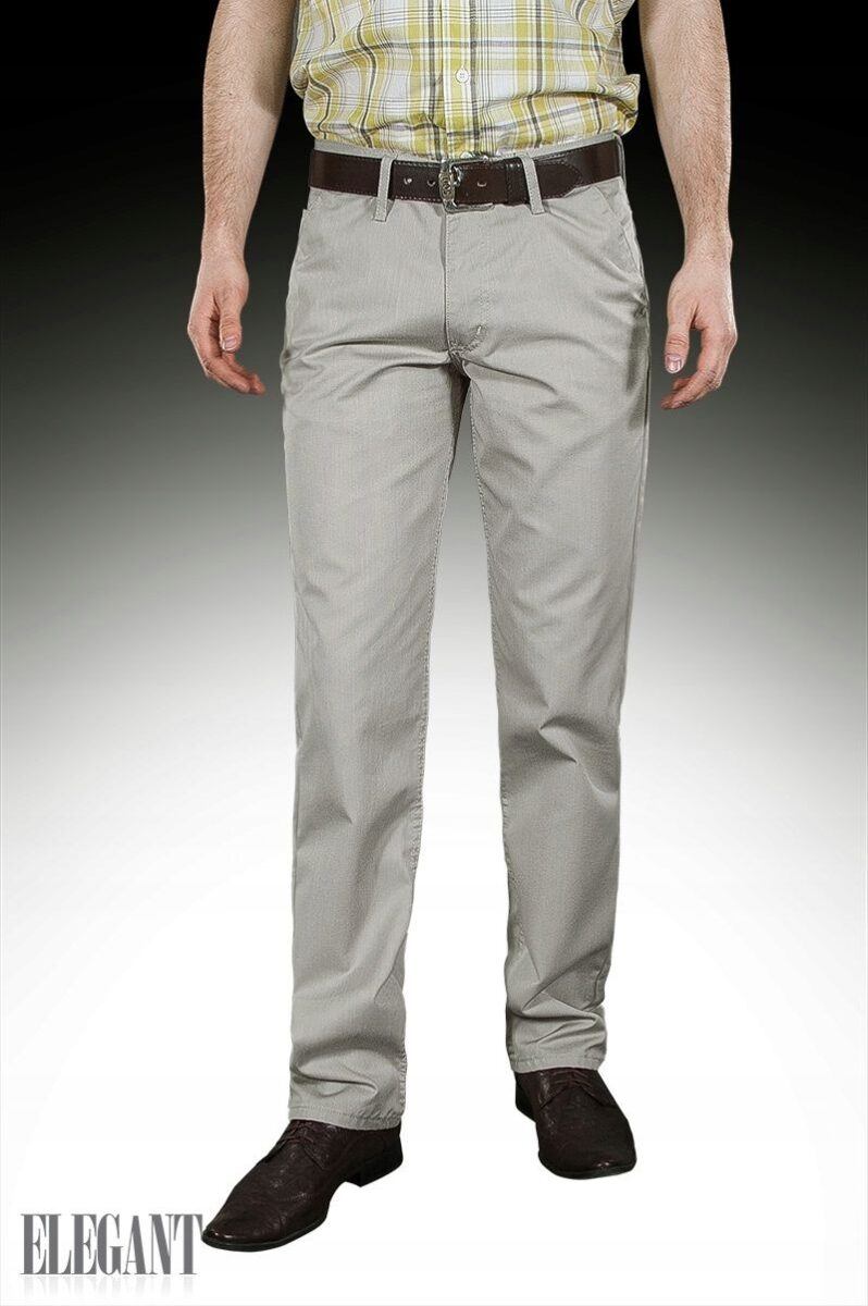 Eleganckie spodnie męskie wizytowe typu Chinosy uszyte z tkaniny 100% bawełnianej w eleganckim i praktycznym szarym kolorze to klasyka wśród klasyki. Z powodzeniem łączą w sobie zalety użytkowe spodni casualowych (wygodny krój jak Chinosy) i klasyczny wygląd spodni wizytowych (elegancki wizytowy materiał). Zapinane są na kryty zamek błyskawiczny i firmowy guzik. Posiadają charakterystyczne dla Chinosów dwie skośne wpuszczane kieszenie z przodu i dwie cięte, wpuszczane kieszenie z tyłu spodni. W pasie szlufki umożliwiające stylizacje z paskiem. Modna lekko zwężana nogawka nie zaprasowana na kant. Najbardziej podatne na uszkodzenia miejsca wzmocnione są dodatkowymi przeszyciami i ozdobnymi nitami.