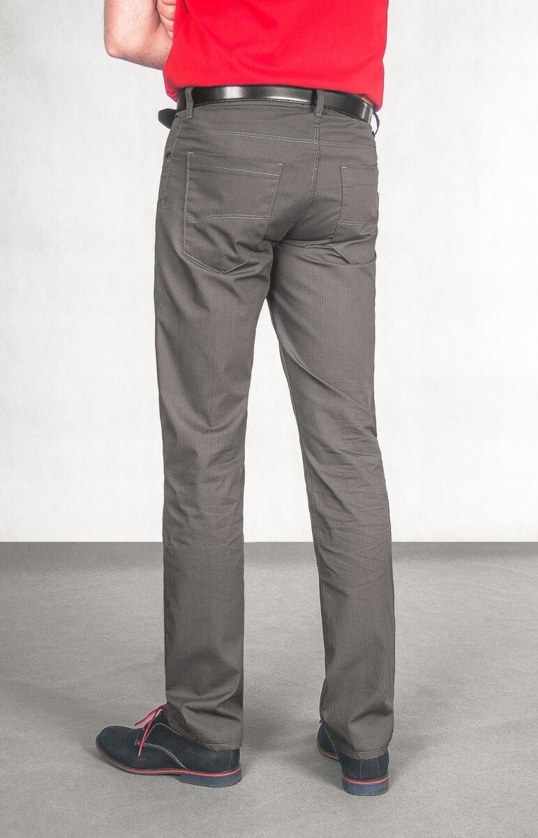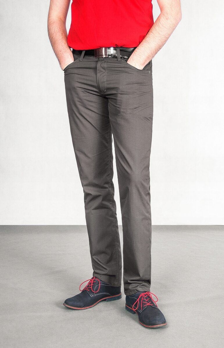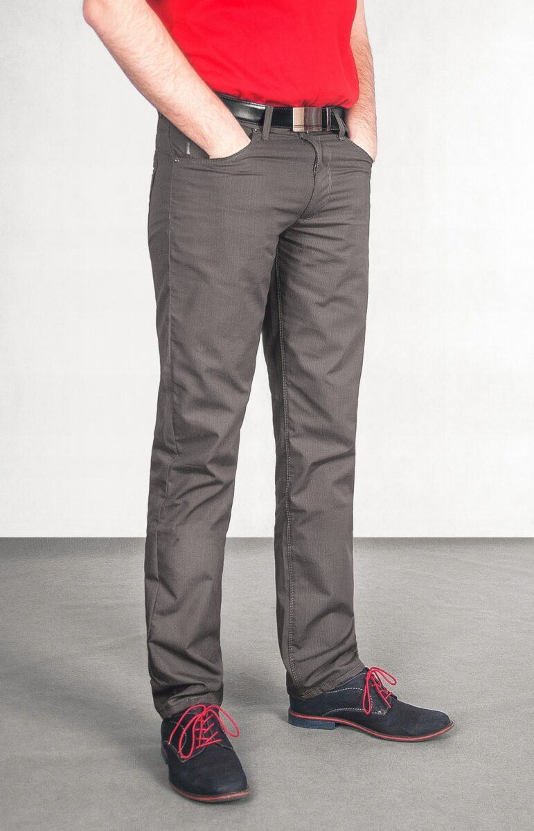 Eleganckie spodnie męskie wizytowe uszyte z eleganckiej tkaniny bawełnianej. Z powodzeniem łączą w sobie zalety użytkowe spodni sportowych (wygodny krój jak jeansy) i klasyczny wygląd spodni wizytowych (elegancki wizytowy materiał). Zapinane są na kryty zamek błyskawiczny i firmowy guzik. Posiadają dwie wpuszczane kieszenie z przodu i dwie naszywane kieszenie z tyłu spodni oraz bilonówkę. W pasie szlufki umożliwiające stylizacje z paskiem. Modna lekko zwężana nogawka nie zaprasowana na kant. Najbardziej podatne na uszkodzenia miejsca wzmocnione są dodatkowymi przeszyciami oraz małymi ozdobnymi nitami.