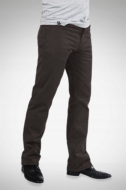 Spodnie męskie wizytowe o linii Slim w kolorze ciemno brązowym w elegancki delikatny prążek. Przeznaczone dla mężczyzn ceniących sobie sportowy, wygodny styl i nienaganną elegancję. Z powodzeniem łączą w sobie zalety użytkowe spodni sportowych (wygodny krój jak jeansy) i klasyczny wygląd spodni wizytowych (elegancki wizytowy materiał). Zapinane na kryty zamek błyskawiczny i guzik. Na bokach dwie kieszenie zaokrąglone wpuszczane oraz mniejsza kieszonka tzw. bilonówka. Na tyle dwie kieszenie nakładane jak w typowych spodniach jeansowych. W pasie szlufki umożliwiające stylizacje z paskiem. Modna zwężana nogawka typu SLIM nie zaprasowana na kant. Najbardziej podatne na uszkodzenia miejsca wzmocnione są dodatkowymi przeszyciami oraz nitami.