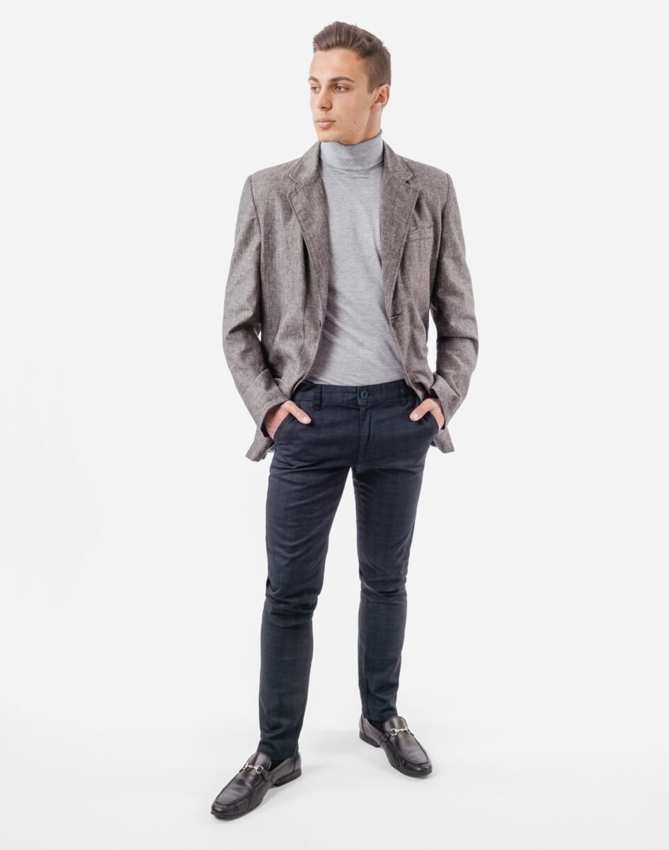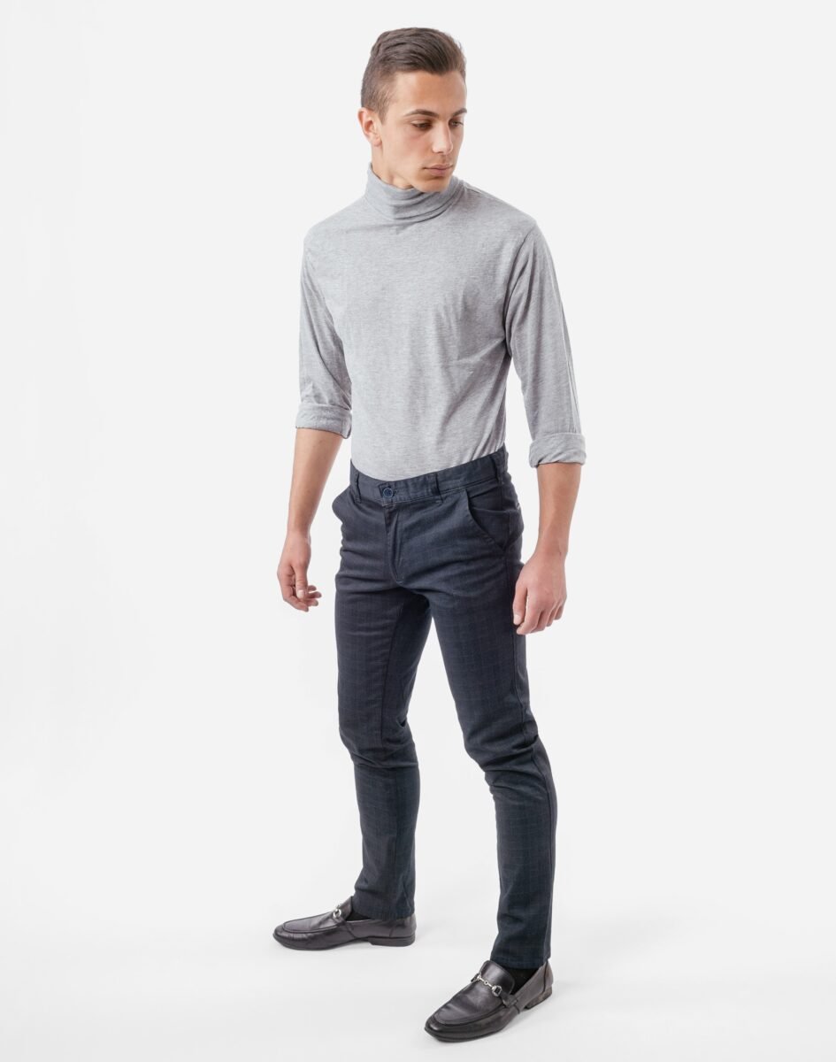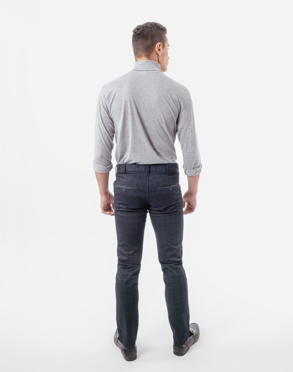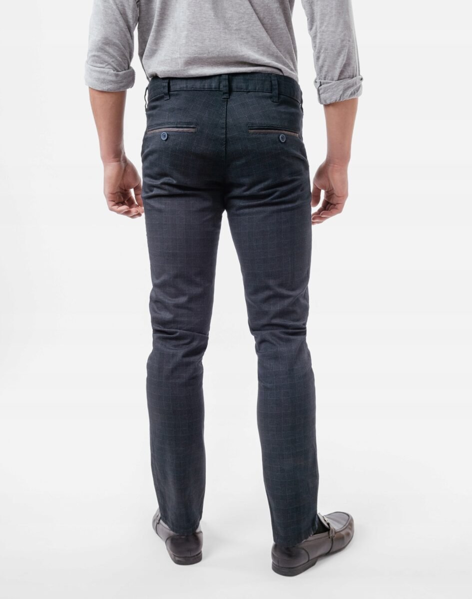 Eleganckie spodnie męskie wizytowe typu Chinosy uszyte z miękkiej tkaniny bawełnianej. Zapinane na kryty zamek błyskawiczny i guzik posiadają charakterystyczne dla Chinosów dwie skośne kieszenie na dłonie na bokach spodni i dwie wpuszczane kieszenie zapinane na guzik z tyłu. W pasie szlufki umożliwiające stylizacje z paskiem. Modna dopasowana nogawka nie zaprasowana na kant. Użyta do produkcji spodni wysokiej jakości tkanina bawełniana jest lekko elastyczna dzięki czemu spodnie są wyjątkowo wygodne w użytkowaniu. Pozwalają na pełną swobodę ruchów, co daje komfort przy siadaniu i zapewnia ogromny komfort noszenia. Najbardziej podatne na uszkodzenia miejsca wzmocnione są dodatkowymi przeszyciami.
