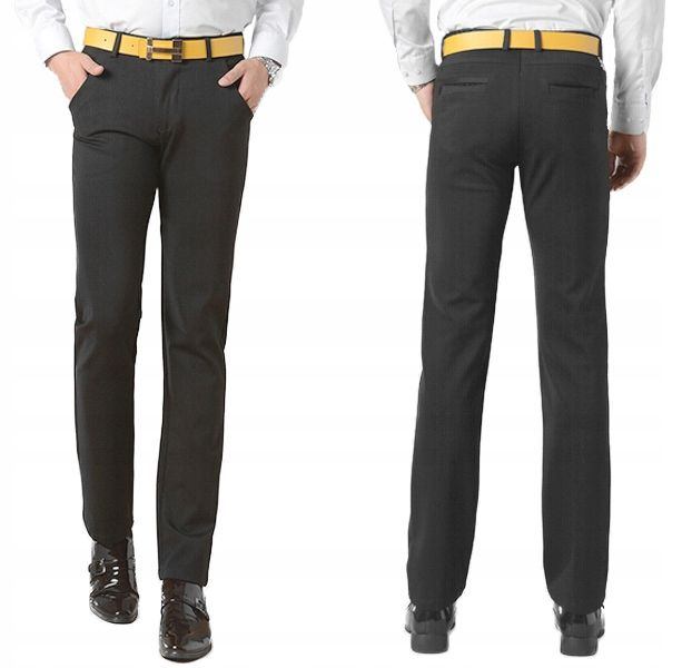 Eleganckie spodnie męskie wizytowe typu Chinosy uszyte z cienkiej tkaniny 100% bawełnianej w kolorze czarnym. Z powodzeniem łączą w sobie zalety użytkowe spodni casualowych (wygodny krój jak Chinosy) i klasyczny wygląd spodni wizytowych (elegancki wizytowy materiał). Zapinane są na kryty zamek błyskawiczny i firmowy guzik. Posiadają charakterystyczne dla Chinosów dwie skośne wpuszczane kieszenie z przodu i dwie wpuszczane kieszenie z tyłu spodni. W pasie szlufki umożliwiające stylizacje z paskiem. Modna lekko zwężana nogawka nie zaprasowana na kant. Najbardziej podatne na uszkodzenia miejsca wzmocnione są dodatkowymi przeszyciami.