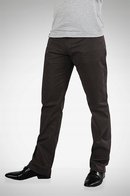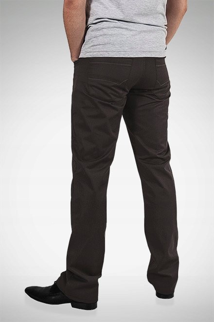 Spodnie męskie wizytowe o linii Slim w kolorze ciemno brązowym w elegancki delikatny prążek. Przeznaczone dla mężczyzn ceniących sobie sportowy, wygodny styl i nienaganną elegancję. Z powodzeniem łączą w sobie zalety użytkowe spodni sportowych (wygodny krój jak jeansy) i klasyczny wygląd spodni wizytowych (elegancki wizytowy materiał). Zapinane na kryty zamek błyskawiczny i guzik. Na bokach dwie kieszenie zaokrąglone wpuszczane oraz mniejsza kieszonka tzw. bilonówka. Na tyle dwie kieszenie nakładane jak w typowych spodniach jeansowych. W pasie szlufki umożliwiające stylizacje z paskiem. Modna zwężana nogawka typu SLIM nie zaprasowana na kant. Najbardziej podatne na uszkodzenia miejsca wzmocnione są dodatkowymi przeszyciami oraz nitami.