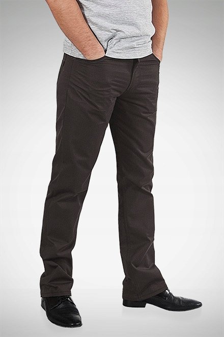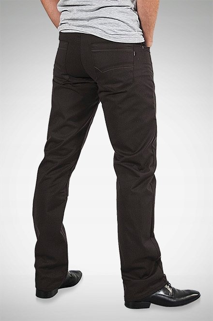 Spodnie męskie wizytowe o linii Slim w kolorze ciemno brązowym w elegancki delikatny prążek. Przeznaczone dla mężczyzn ceniących sobie sportowy, wygodny styl i nienaganną elegancję. Z powodzeniem łączą w sobie zalety użytkowe spodni sportowych (wygodny krój jak jeansy) i klasyczny wygląd spodni wizytowych (elegancki wizytowy materiał). Zapinane na kryty zamek błyskawiczny i guzik. Na bokach dwie kieszenie zaokrąglone wpuszczane oraz mniejsza kieszonka tzw. bilonówka. Na tyle dwie kieszenie nakładane jak w typowych spodniach jeansowych. W pasie szlufki umożliwiające stylizacje z paskiem. Modna zwężana nogawka typu SLIM nie zaprasowana na kant. Najbardziej podatne na uszkodzenia miejsca wzmocnione są dodatkowymi przeszyciami oraz nitami.