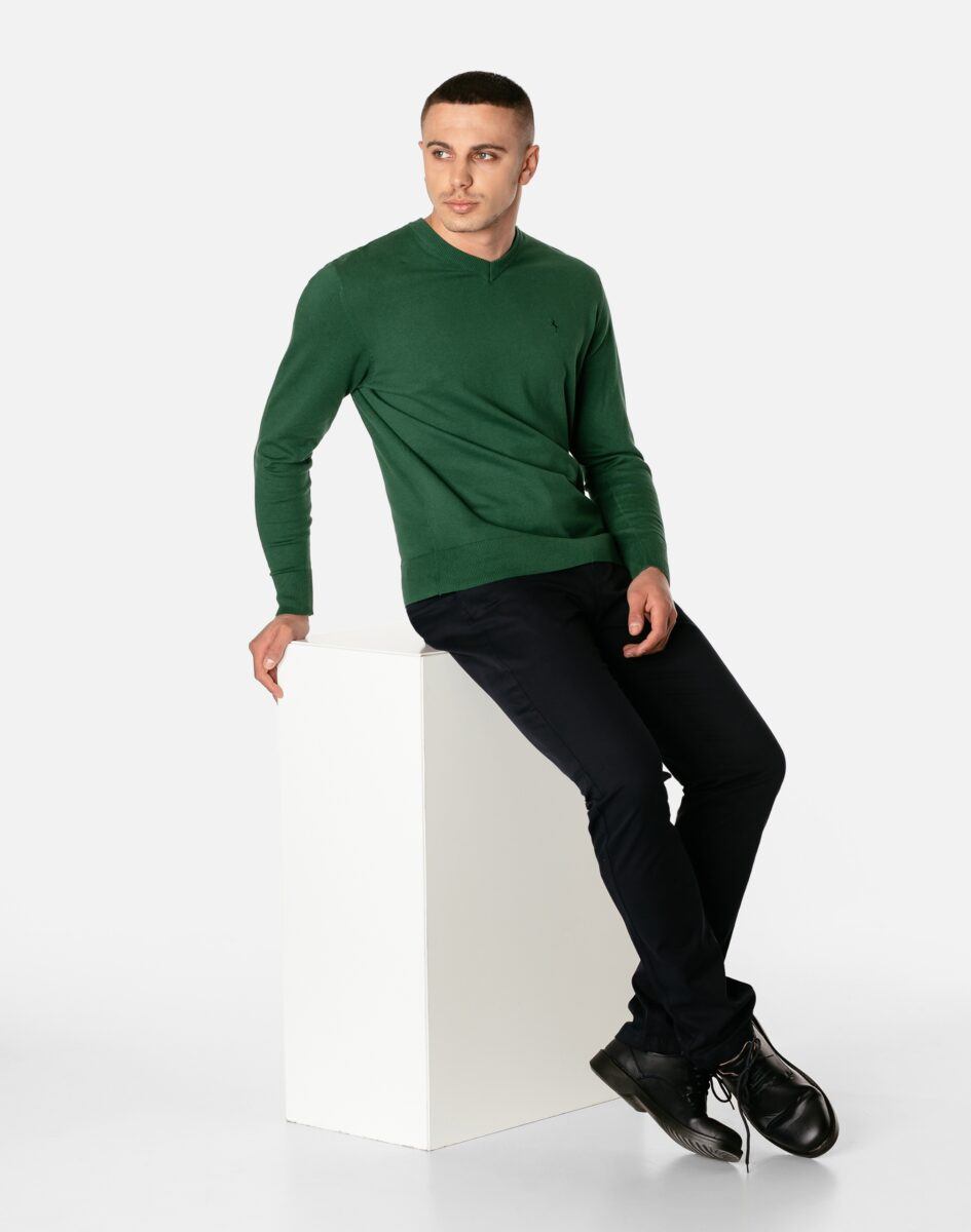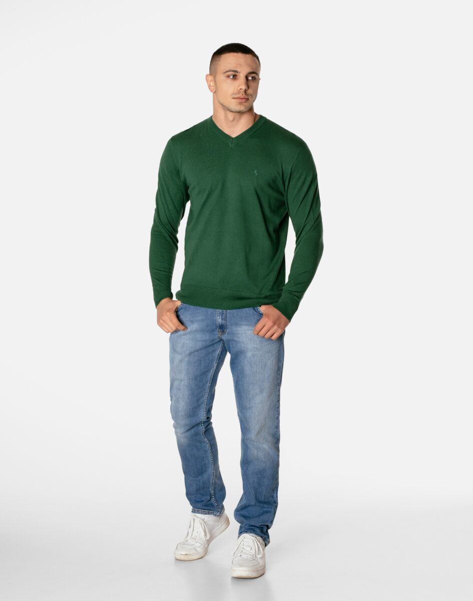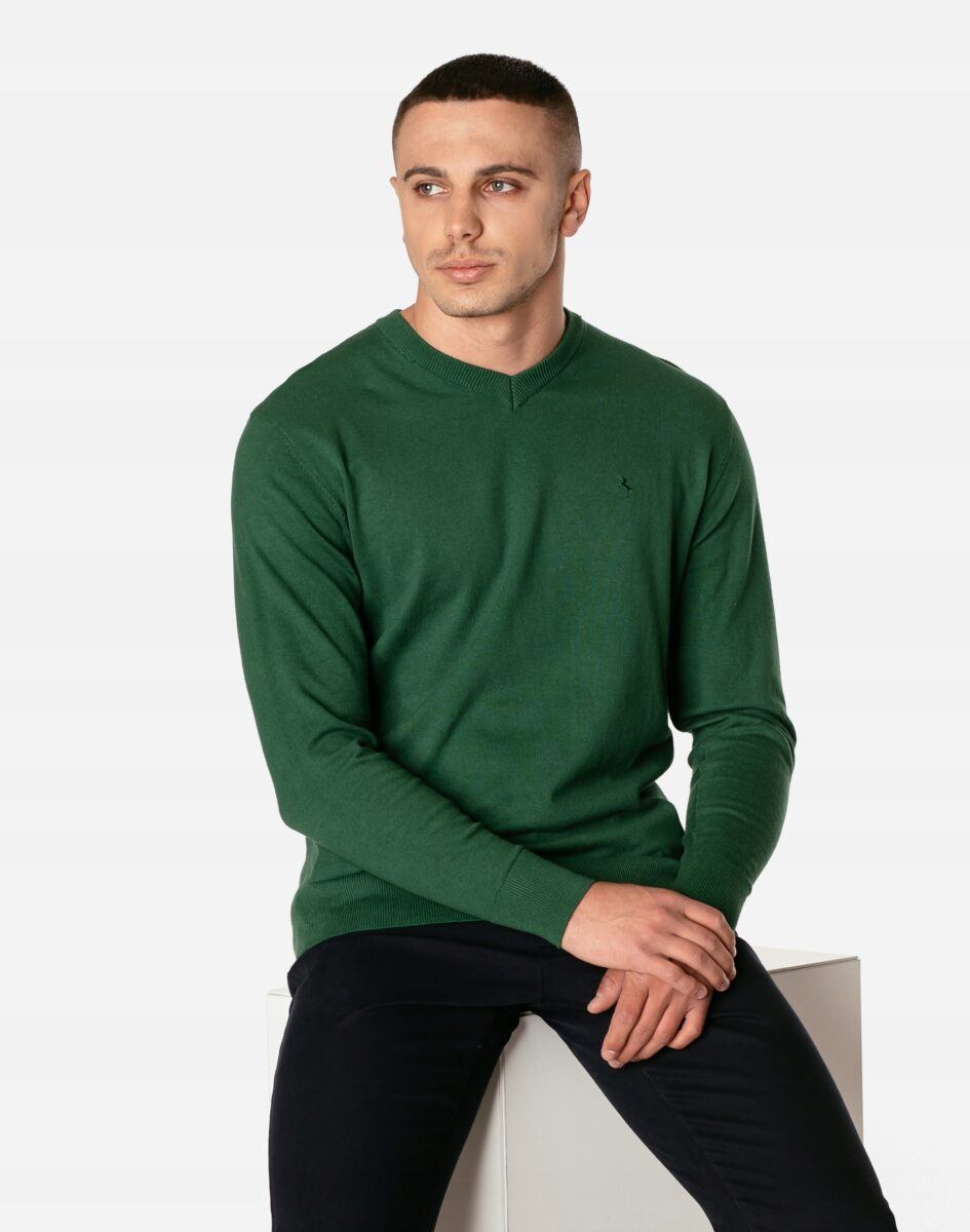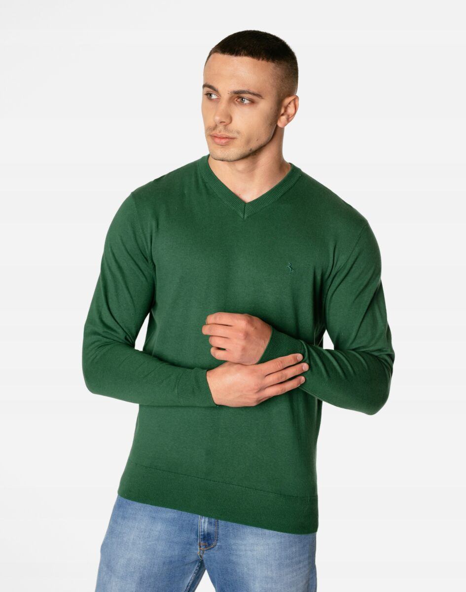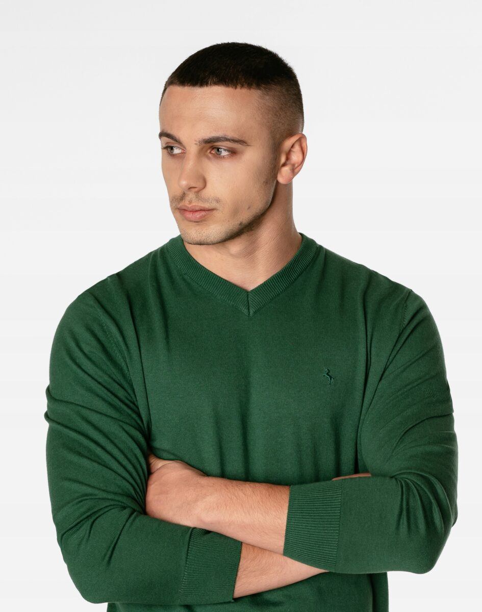 Cienki sweterek męski typu „V-neck” z najnowszej kolekcji firmy VERTIGO PREMIUM to ikona klasycznego męskiego stylu łącząca w sobie walory estetyczne z funkcjonalnością. Wkładany przez głowę, dół swetra i mankiety wykonane ze sprężystej dzianiny ściągaczowej. Wyprodukowany z wysokogatunkowej dzianiny swetrowej o drobnym splocie zapewniającej wysoki komfort noszenia i swobodę ruchów. Dzięki dużej zawartości bawełny sweterek jest przewiewny, przyjazny dla alergików i łatwy do utrzymania w czystości. Niewielki dodatek nylonu zapewnia pełną swobodę ruchów, wygodę noszenia oraz stabilność rozmiarów i koloru po wielokrotnym praniu. Model wygodny i uniwersalny, doskonale sprawdzi się zarówno w formalnych jak i mniej formalnych stylizacjach. Dzięki swojej prostocie bardzo elegancki. Doskonale wygląda zarówno z jeansami, sztruksami, chinosami jak i spodniami materiałowymi a zastąpienie cienkim sweterkiem koszuli pod marynarką w obecnym sezonie to jedno z najmodniejszych połączeń.