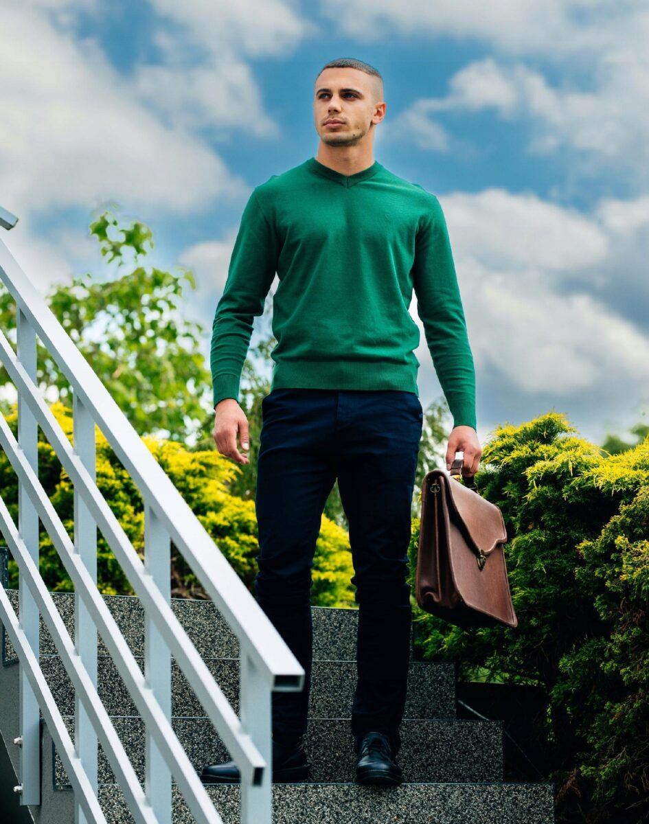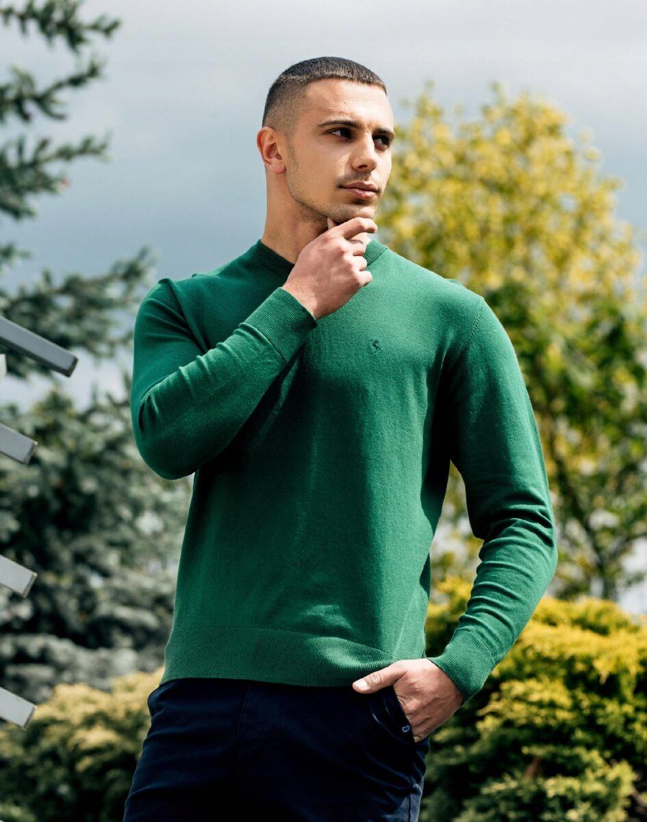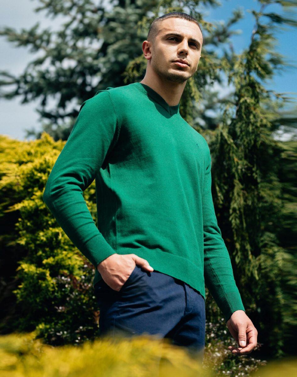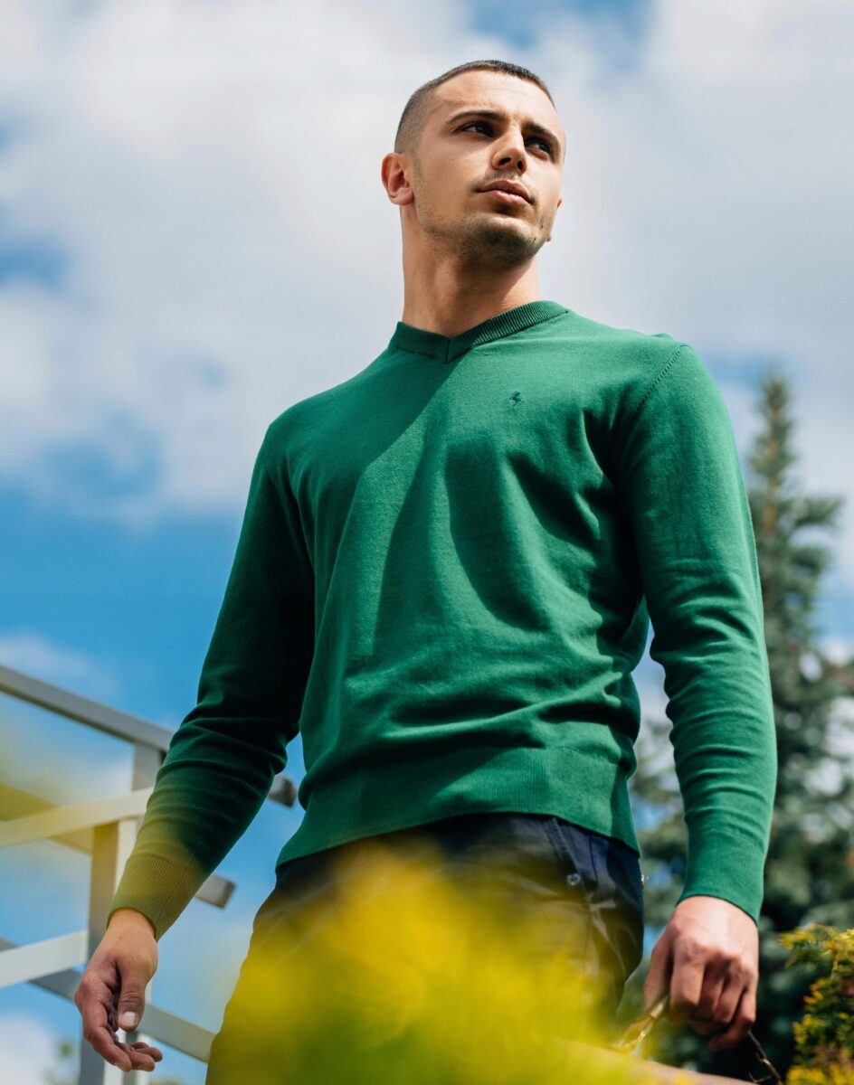Swetry są bardzo fajne nie tylko na zimę, czy jesień. Wbrew pozorom w cienkim swetrze z dekoltem V-neck możecie czuć się wiosną, jesienią a nawet latem bardziej komfortowo niż w bluzie bo ze względu na luźniejszy splot tkaniny zapewnia znacznie lepszą cyrkulację powietrza. W zimie możesz go nosić pod kurtką, a wiosną, jesienią i latem przyda się jako samodzielne okrycie w chłodniejsze lub wietrzne dni. Zapewnia ciepło podczas zimnej i wietrznej pogody a wraz ze wzrostem temperatury wystarczy modnie podciągnąć rękawy by poczuć się w nim komfortowo. Dekolt V-neck dodaje szyku i stylu oraz ułatwia zakładanie. Taki dekolt wizualnie wydłuża szyję, podkreśla kształt twarzy, a jednocześnie maskuje szerokie ramiona. Z tego powodu właśnie panowie bardzo chętnie wybierają ten krój.