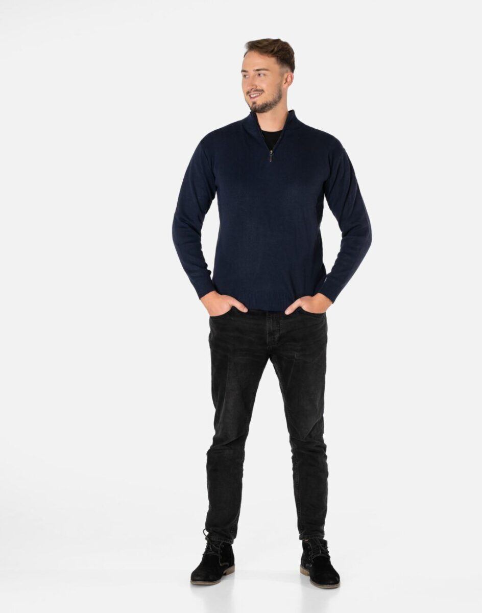 Klasyczny sweter męski typu półgolf zwracający uwagę praktyczną rozpinaną stójką z najnowszej kolekcji jesień/zima. Wkładany przez głowę, dół swetra i mankiety wykonane ze sprężystej dzianiny ściągaczowej. Wysoki kołnierz/stójka skutecznie chroni podbródek i szyję a często zastępuje nawet szalik co jest bardzo wygodne. Wyprodukowany z wysokogatunkowej dzianiny swetrowej zapewniającej wysoki komfort noszenia i swobodę ruchów. Naturalna wełna to gwarancja wspaniałej izolacji cieplnej oraz oddychania skóry. Akryl i elastan zapewniają pełną swobodę ruchów, wygodę noszenia oraz stabilność rozmiarów i koloru po wielokrotnym praniu. Dodatkową zaletą akrylu jest to, że, w przeciwieństwie do wielu włókien naturalnych, nie powoduje on alergii ani podrażnień skórnych. Jest to więc doskonała alternatywa dla osób, które z powodu uczuleń nie mogą nosić innych tkanin. Akryl jest sprężysty, przez co nie gniecie się ani nie odkształca – pomaga więc uniknąć długiego i uciążliwego prasowania, a ubranie wygląda dobrze przez cały dzień. Ponadto nie wymaga on specjalnej pielęgnacji, można go normalnie prać, a ponieważ jest materiałem sztucznym, nie dotyczy go też problem moli ubraniowych. Model wygodny i uniwersalny, doskonale sprawdzi się zarówno w formalnych jak i mniej formalnych stylizacjach. Dzięki swojej prostocie bardzo elegancki. Doskonale wygląda zarówno z jeansami, sztruksami, jak i chinosami w stylu preppy.