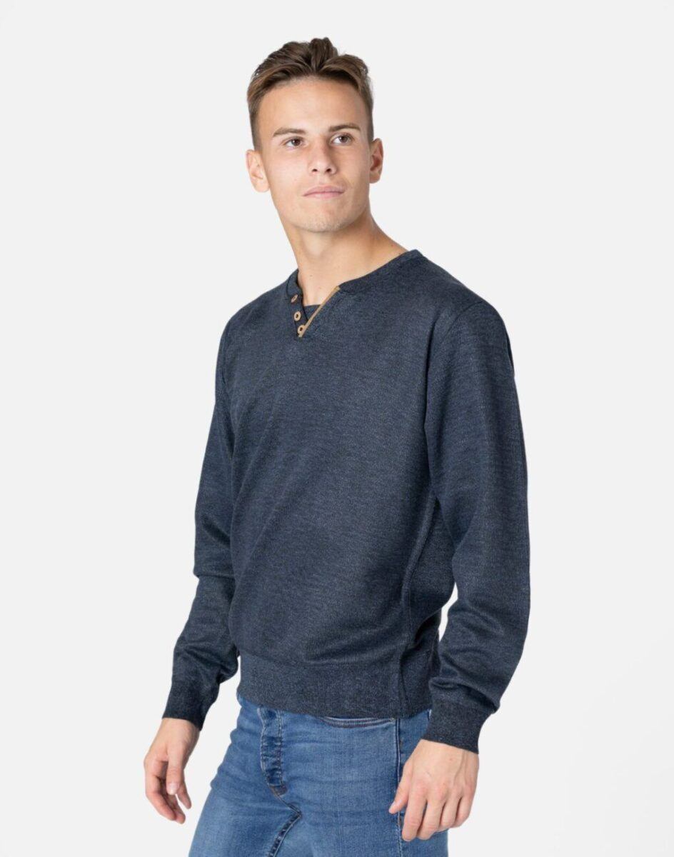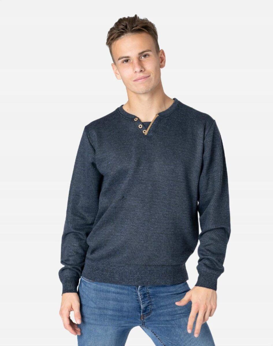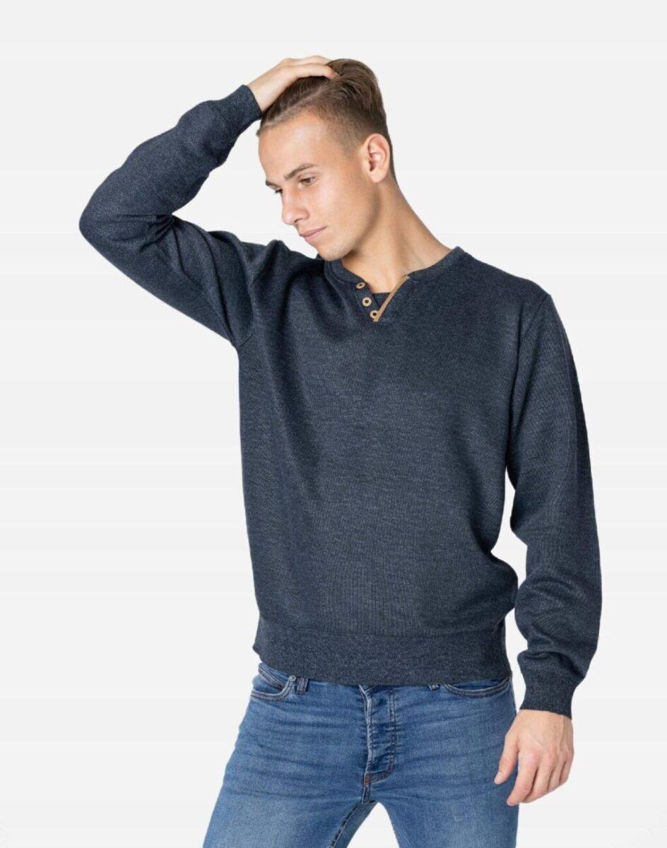Klasyczny męski sweter z dekoltem V-Neck wykończonym ozdobnymi guziczkami z najnowszej kolekcji jesień/zima. Dół swetra i mankiety wykonane ze sprężystej dzianiny ściągaczowej. Wyprodukowany z wysokogatunkowej przyjemnej w dotyku dzianiny swetrowej średniej grubości o drobnym splocie cechującej się wysoką trwałością i komfortem noszenia. Naturalna wełna to gwarancja wspaniałej izolacji cieplnej oraz oddychania skóry. Akryl i spandex gwarantuje pełną swobodę ruchów, wygodę noszenia i stabilność rozmiarów i koloru po wielokrotnym praniu.