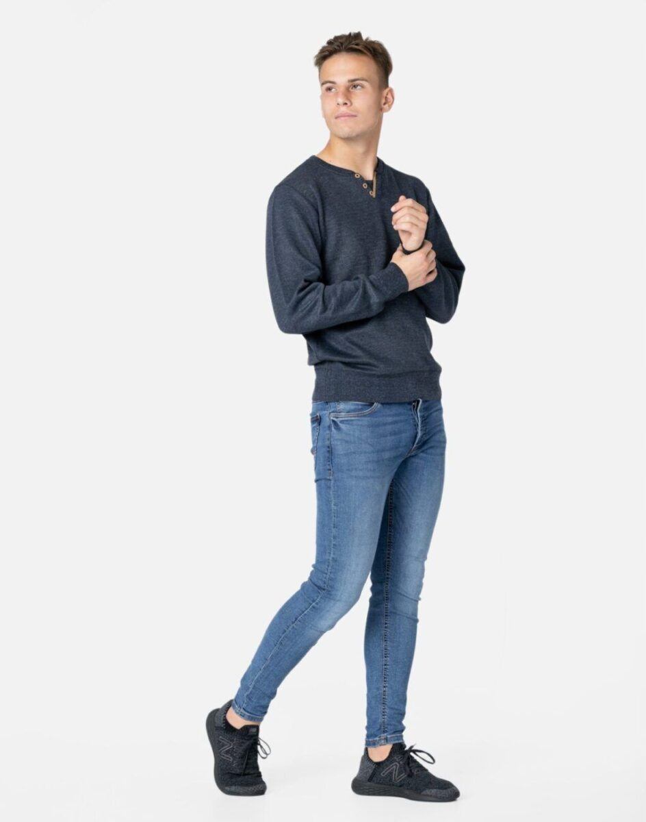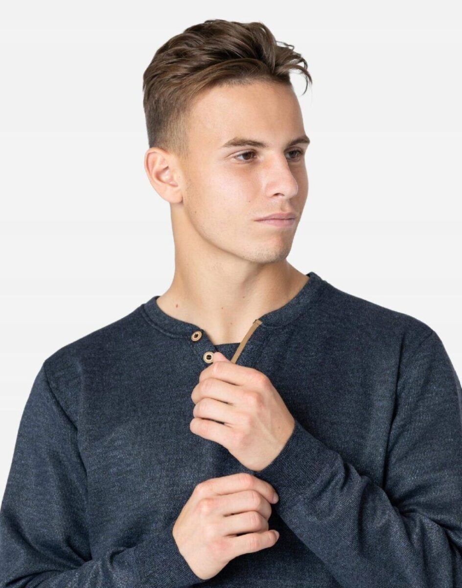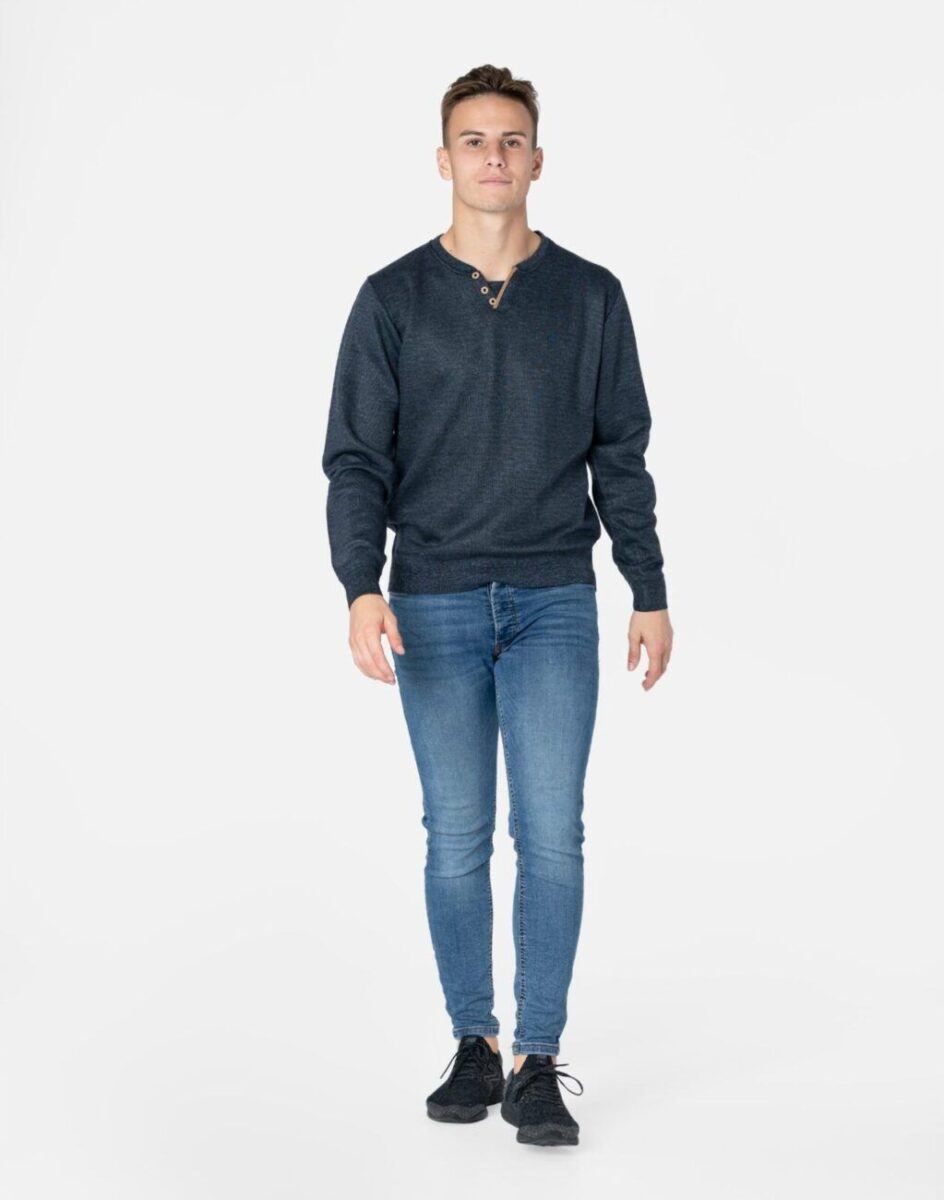 Klasyczny męski sweter z dekoltem V-Neck wykończonym ozdobnymi guziczkami z najnowszej kolekcji jesień/zima. Dół swetra i mankiety wykonane ze sprężystej dzianiny ściągaczowej. Wyprodukowany z wysokogatunkowej przyjemnej w dotyku dzianiny swetrowej średniej grubości o drobnym splocie cechującej się wysoką trwałością i komfortem noszenia. Naturalna wełna to gwarancja wspaniałej izolacji cieplnej oraz oddychania skóry. Akryl i spandex gwarantuje pełną swobodę ruchów, wygodę noszenia i stabilność rozmiarów i koloru po wielokrotnym praniu.