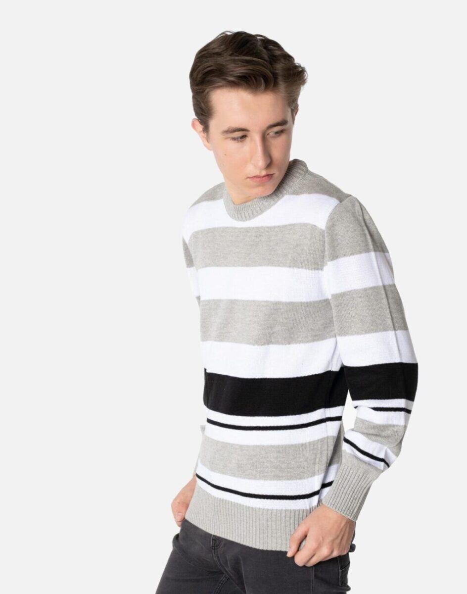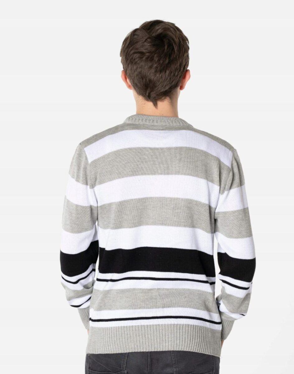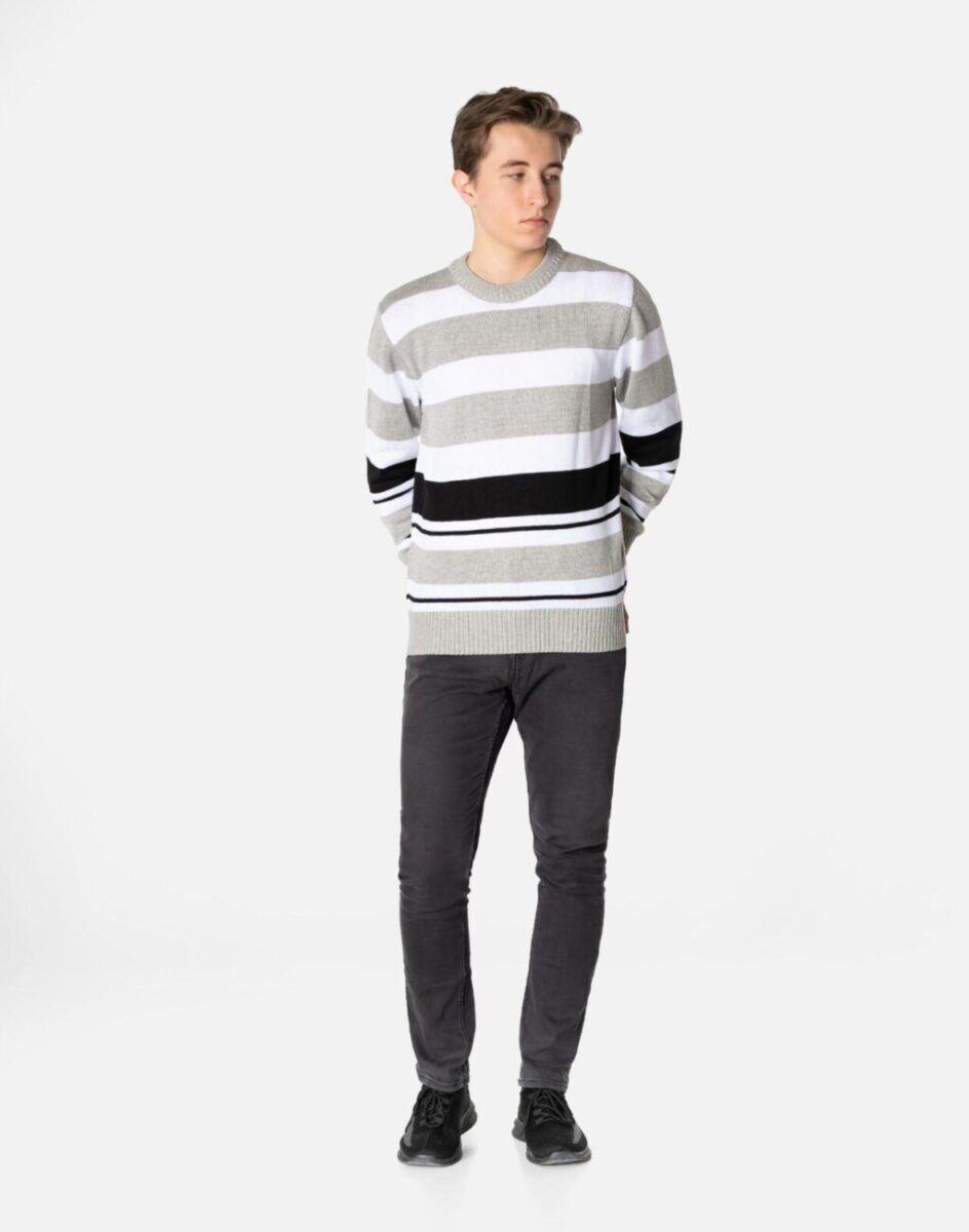 Klasyczny męski sweter typu round-neck z najnowszej kolekcji firmy Rivi Sports Wear zwracający uwagę efektownym wzorem w poziome paski o ponadczasowej kolorystyce. Wyprodukowany z wysokogatunkowej dzianiny swetrowej zapewniającej wysoki komfort noszenia i swobodę ruchów. Odpowiedni krój swetra nie ogranicza swobody ruchów a niewielka gramatura pozytywnie wpływa na komfort użytkowania. Wkładany przez głowę, dół swetra i mankiety wykonane ze sprężystej dzianiny ściągaczowej. Model wygodny i uniwersalny, doskonale sprawdzi się zarówno w formalnych jak i mniej formalnych stylizacjach. Dzięki swojej prostocie bardzo elegancki. Doskonale wygląda zarówno z jeansami, sztruksami, jak i chinosami w stylu preppy.