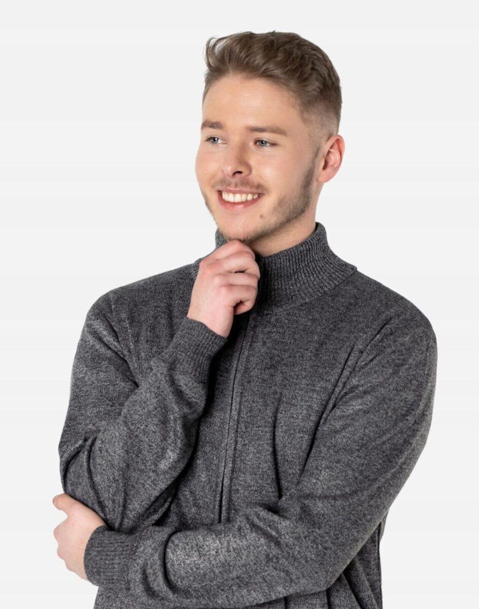 Klasyczny męski sweter półgolf rozsuwany z najnowszej kolekcji jesień/zima/wiosna. Dół swetra, kołnierz i mankiety wykonane ze sprężystej dzianiny ściągaczowej. Wysoki kołnierz/stójka skutecznie chroni podbródek i szyję a często zastępuje nawet szalik co jest bardzo wygodne. Wyprodukowany z miękkiej dzianiny swetrowej średniej grubości o drobnym splocie zapewniającej wysoki komfort noszenia. Naturalna wełna to gwarancja wspaniałej izolacji cieplnej oraz oddychania skóry. Akryl i elastan zapewniają pełną swobodę ruchów, wygodę noszenia i stabilność rozmiarów po wielokrotnym praniu. Dodatkowo zaletą akrylu jest to, że, w przeciwieństwie do wielu włókien naturalnych, nie powoduje on alergii ani podrażnień skórnych. Jest to więc doskonała alternatywa dla osób, które z powodu uczuleń nie mogą nosić innych tkanin. Akryl jest sprężysty, przez co nie gniecie się ani nie odkształca – pomaga więc uniknąć długiego i uciążliwego prasowania, a ubranie wygląda dobrze przez cały dzień. Ponadto nie wymaga on specjalnej pielęgnacji, można go normalnie prać, a ponieważ jest materiałem sztucznym, nie dotyczy go też problem moli ubraniowych.
