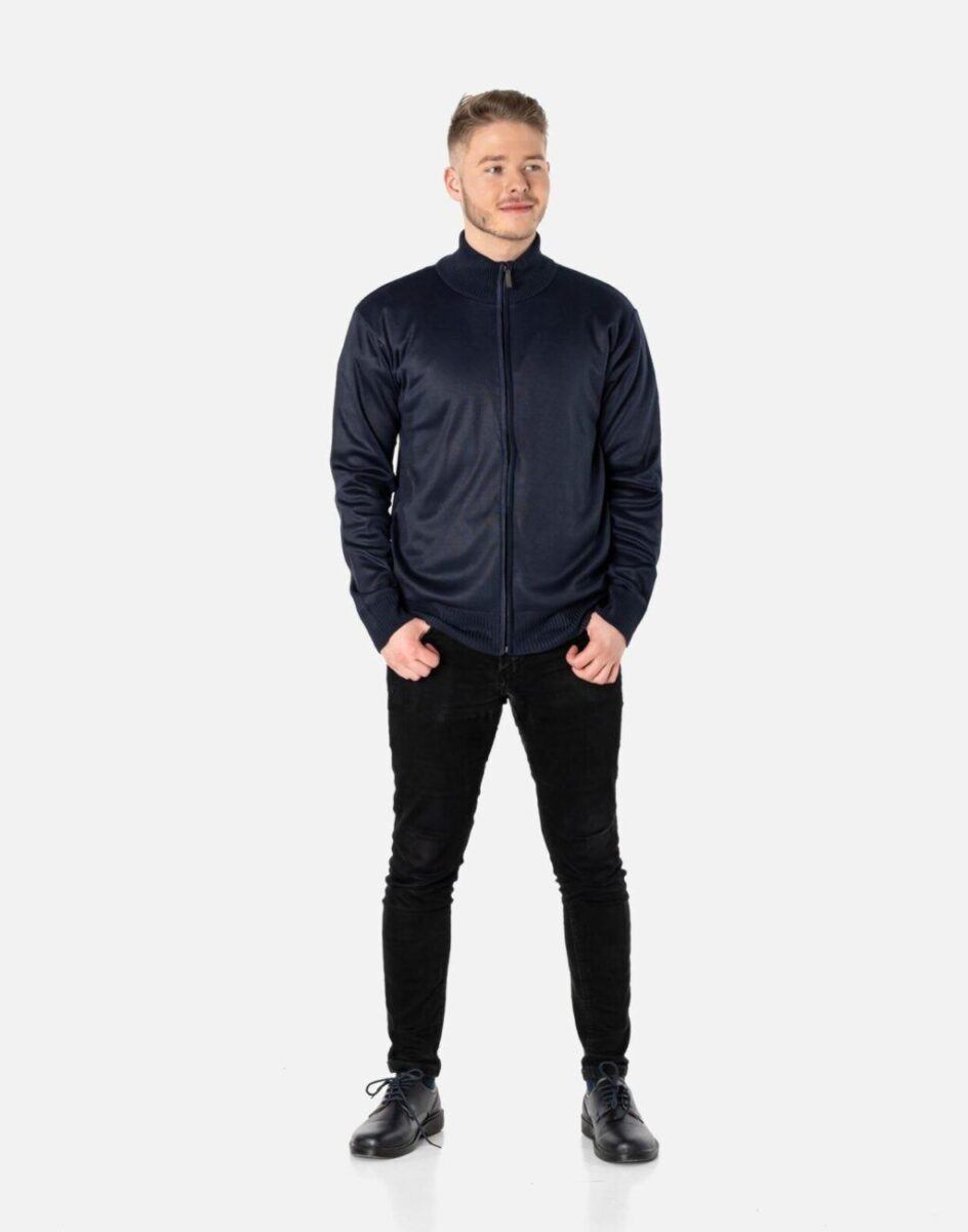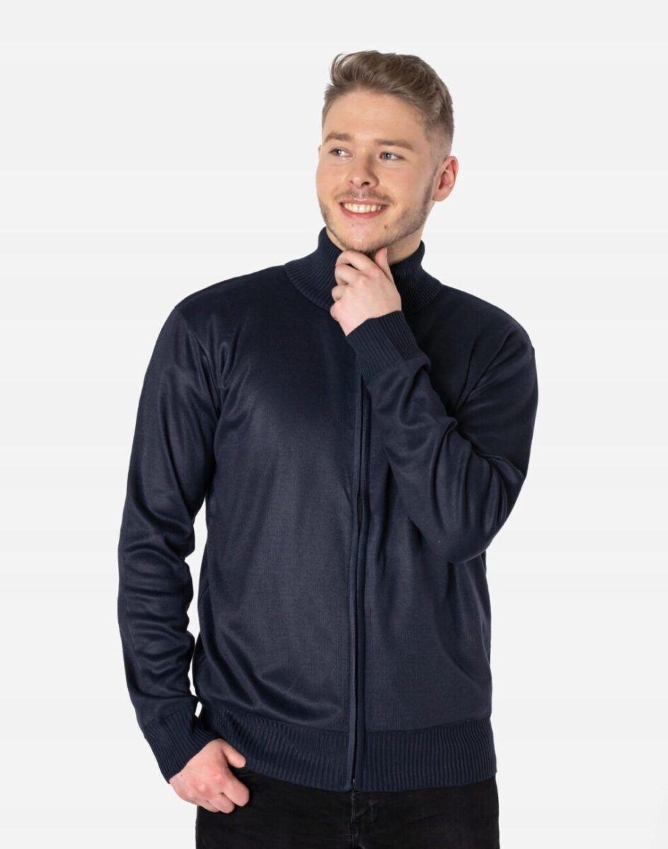 Klasyczny męski sweter półgolf rozsuwany z najnowszej kolekcji jesień/zima/wiosna. Dół swetra, kołnierz i mankiety wykonane ze sprężystej dzianiny ściągaczowej. Wysoki kołnierz/stójka skutecznie chroni podbródek i szyję a często zastępuje nawet szalik co jest bardzo wygodne. Wyprodukowany z miękkiej dzianiny swetrowej średniej grubości o drobnym splocie zapewniającej wysoki komfort noszenia. Naturalna wełna to gwarancja wspaniałej izolacji cieplnej oraz oddychania skóry. Akryl i elastan zapewniają pełną swobodę ruchów, wygodę noszenia i stabilność rozmiarów po wielokrotnym praniu. Dodatkowo zaletą akrylu jest to, że, w przeciwieństwie do wielu włókien naturalnych, nie powoduje on alergii ani podrażnień skórnych. Jest to więc doskonała alternatywa dla osób, które z powodu uczuleń nie mogą nosić innych tkanin. Akryl jest sprężysty, przez co nie gniecie się ani nie odkształca – pomaga więc uniknąć długiego i uciążliwego prasowania, a ubranie wygląda dobrze przez cały dzień. Ponadto nie wymaga on specjalnej pielęgnacji, można go normalnie prać, a ponieważ jest materiałem sztucznym, nie dotyczy go też problem moli ubraniowych.