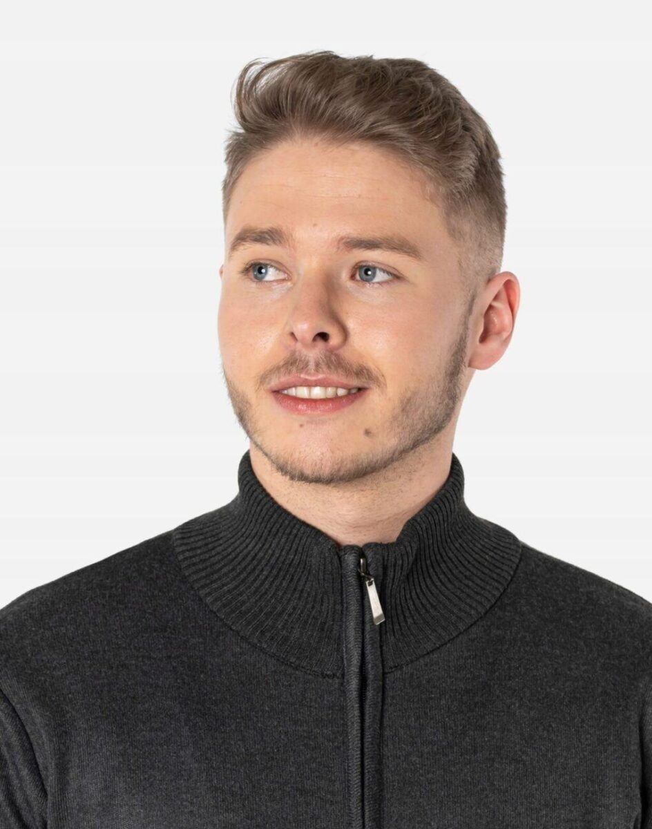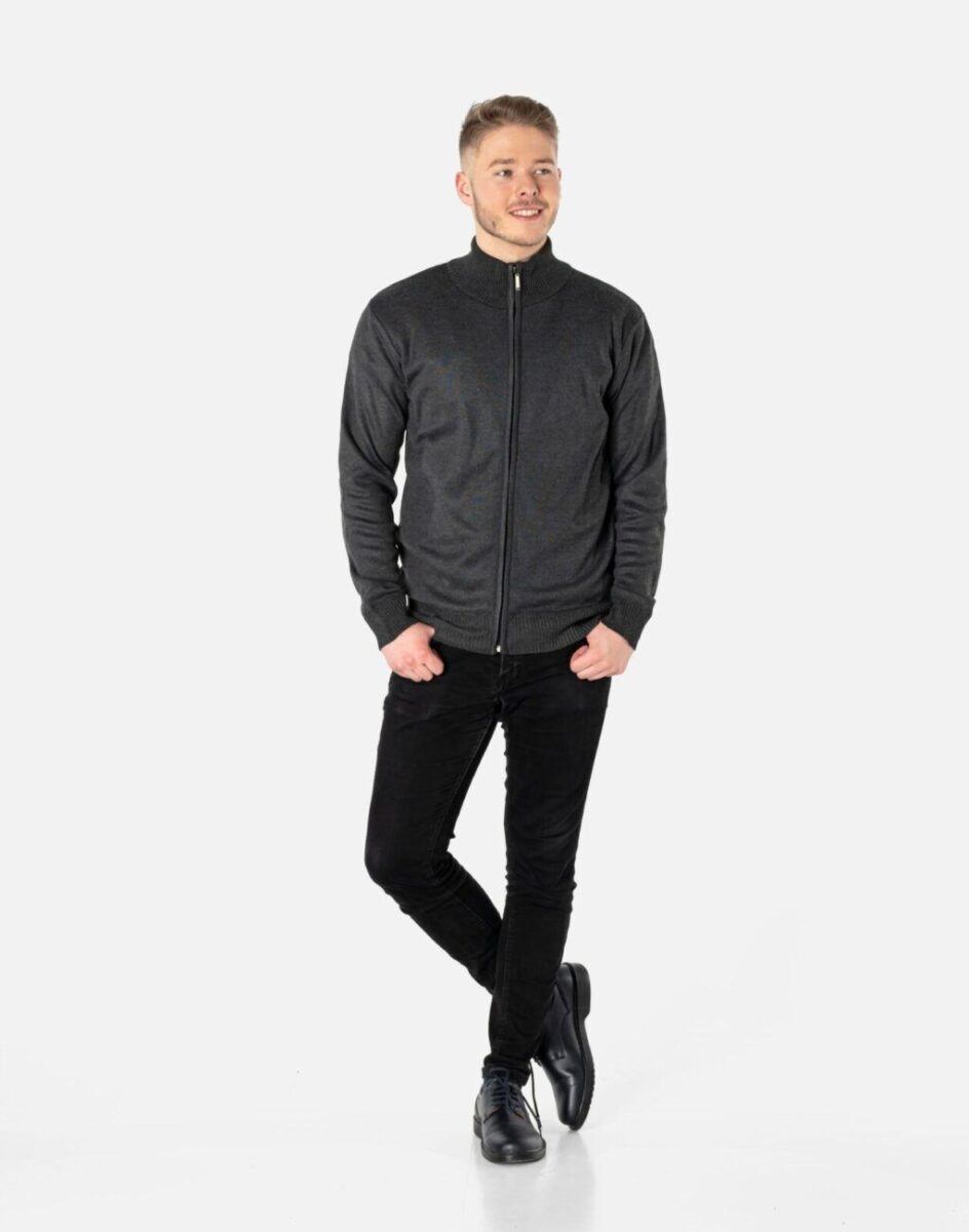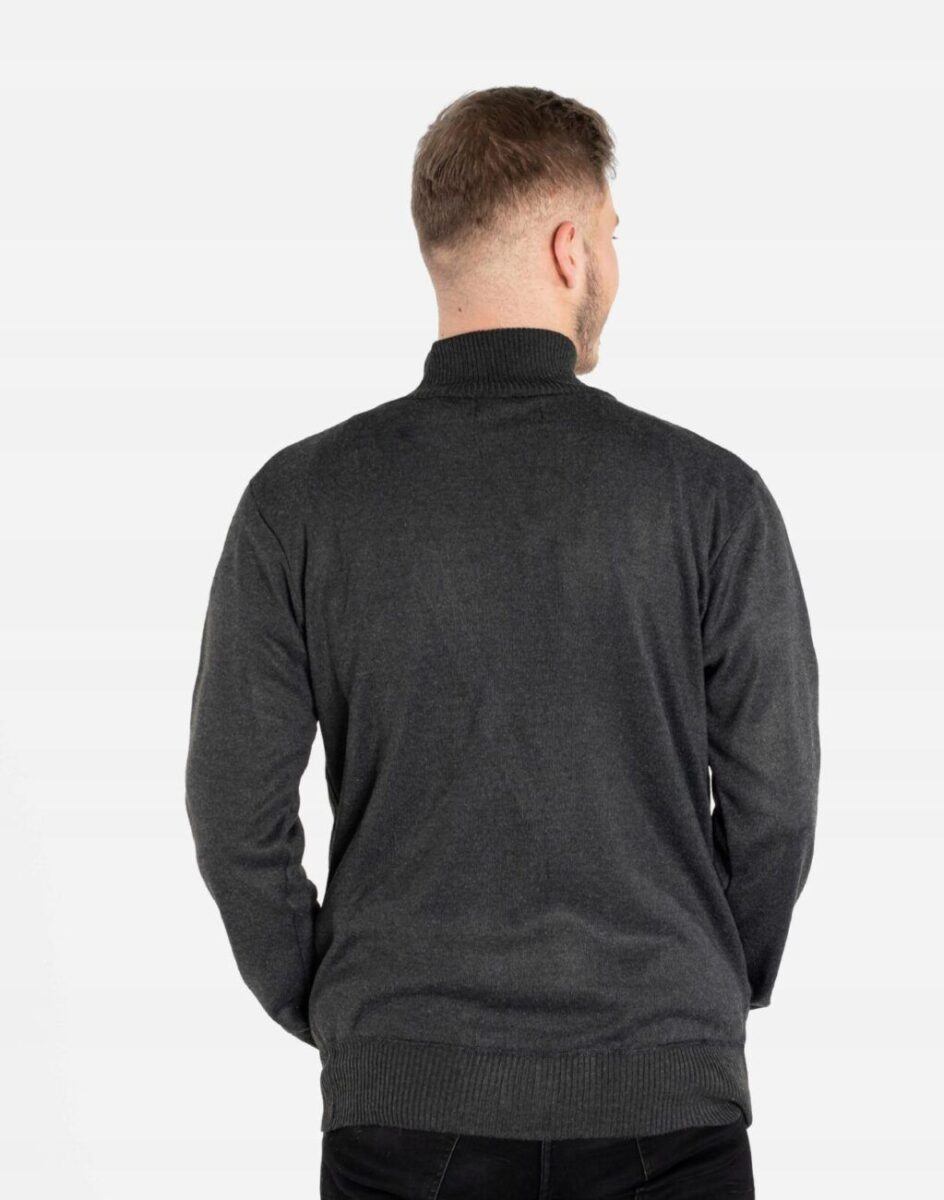Klasyczny męski sweter półgolf rozsuwany z najnowszej kolekcji jesień/zima/wiosna. Dół swetra, kołnierz i mankiety wykonane ze sprężystej dzianiny ściągaczowej. Wysoki kołnierz/stójka skutecznie chroni podbródek i szyję a często zastępuje nawet szalik co jest bardzo wygodne. Wyprodukowany z miękkiej dzianiny swetrowej średniej grubości o drobnym splocie zapewniającej wysoki komfort noszenia. Naturalna wełna to gwarancja wspaniałej izolacji cieplnej oraz oddychania skóry. Akryl i elastan zapewniają pełną swobodę ruchów, wygodę noszenia i stabilność rozmiarów po wielokrotnym praniu. Dodatkowo zaletą akrylu jest to, że, w przeciwieństwie do wielu włókien naturalnych, nie powoduje on alergii ani podrażnień skórnych. Jest to więc doskonała alternatywa dla osób, które z powodu uczuleń nie mogą nosić innych tkanin. Akryl jest sprężysty, przez co nie gniecie się ani nie odkształca – pomaga więc uniknąć długiego i uciążliwego prasowania, a ubranie wygląda dobrze przez cały dzień. Ponadto nie wymaga on specjalnej pielęgnacji, można go normalnie prać, a ponieważ jest materiałem sztucznym, nie dotyczy go też problem moli ubraniowych.