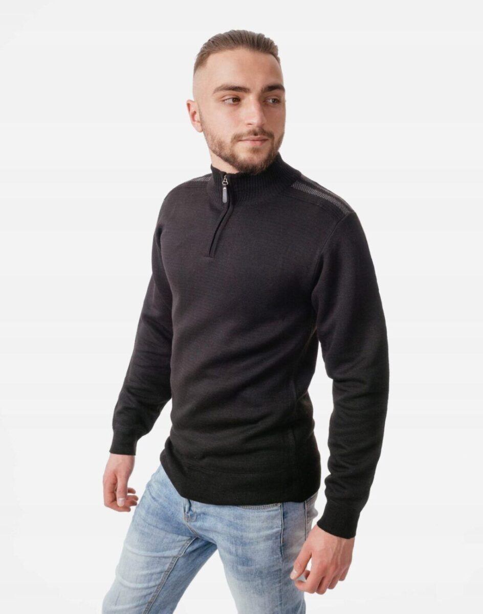 Klasyczny męski sweter półgolf z rozsuwaną stójką z najnowszej kolekcji jesień/zima. Dół swetra i mankiety wykonane ze sprężystej dzianiny ściągaczowej. Wysoki kołnierz/stójka skutecznie chroni podbródek i szyję a często zastępuje nawet szalik co jest bardzo wygodne. Wyprodukowany z miękkiej dzianiny swetrowej średniej grubości o drobnym splocie zapewniającej wysoki komfort noszenia. Naturalna wełna to gwarancja wspaniałej izolacji cieplnej oraz oddychania skóry. Akryl i spandex gwarantuje pełną swobodę ruchów, wygodę noszenia i stabilność rozmiarów po wielokrotnym praniu.