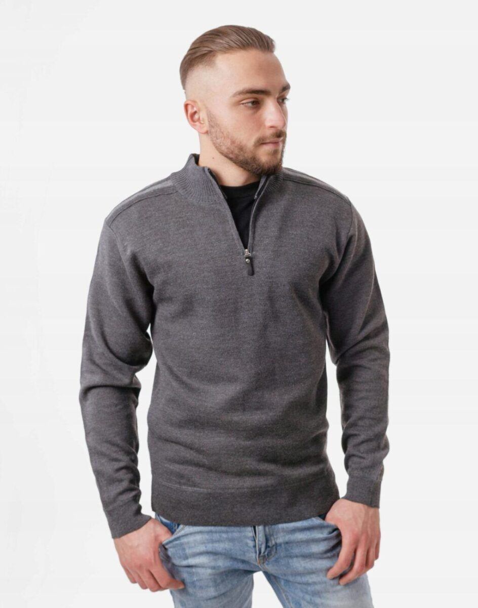 Klasyczny męski sweter półgolf z rozsuwaną stójką z najnowszej kolekcji jesień/zima. Dół swetra i mankiety wykonane ze sprężystej dzianiny ściągaczowej. Wysoki kołnierz/stójka skutecznie chroni podbródek i szyję a często zastępuje nawet szalik co jest bardzo wygodne. Wyprodukowany z miękkiej dzianiny swetrowej średniej grubości o drobnym splocie zapewniającej wysoki komfort noszenia. Naturalna wełna to gwarancja wspaniałej izolacji cieplnej oraz oddychania skóry. Akryl i spandex gwarantuje pełną swobodę ruchów, wygodę noszenia i stabilność rozmiarów po wielokrotnym praniu.