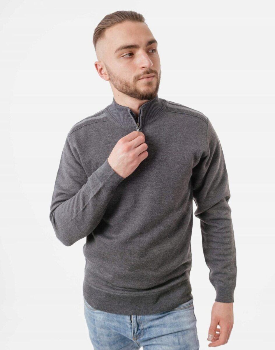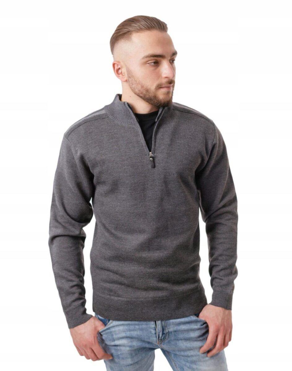 Klasyczny męski sweter półgolf z rozsuwaną stójką z najnowszej kolekcji jesień/zima. Dół swetra i mankiety wykonane ze sprężystej dzianiny ściągaczowej. Wysoki kołnierz/stójka skutecznie chroni podbródek i szyję a często zastępuje nawet szalik co jest bardzo wygodne. Wyprodukowany z miękkiej dzianiny swetrowej średniej grubości o drobnym splocie zapewniającej wysoki komfort noszenia. Naturalna wełna to gwarancja wspaniałej izolacji cieplnej oraz oddychania skóry. Akryl i spandex gwarantuje pełną swobodę ruchów, wygodę noszenia i stabilność rozmiarów po wielokrotnym praniu.