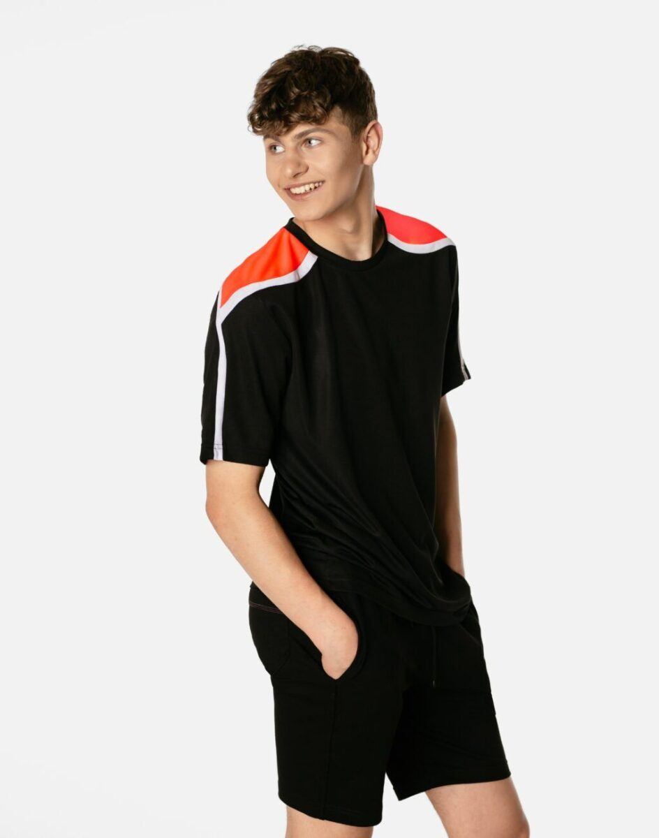 - Wzór: kolor jednolity z kontrastowymi wstawkami na ramionach