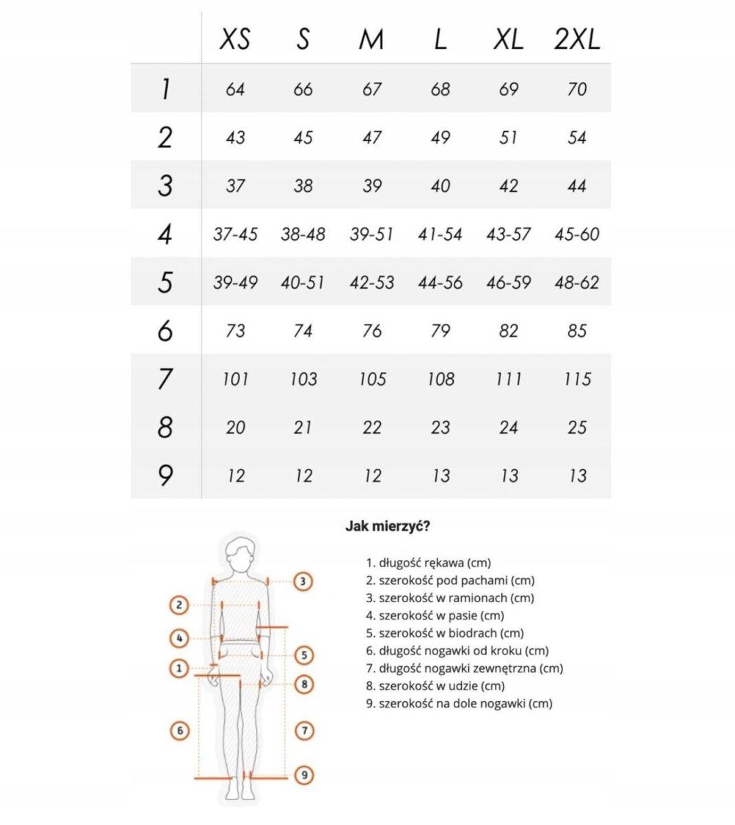 - Struktura/rodzaj materiału: termoaktywny, oddychający, odprowadzający wilgoć, antyzapachowy, rozciągliwy w czterech kierunkach, sprężysty